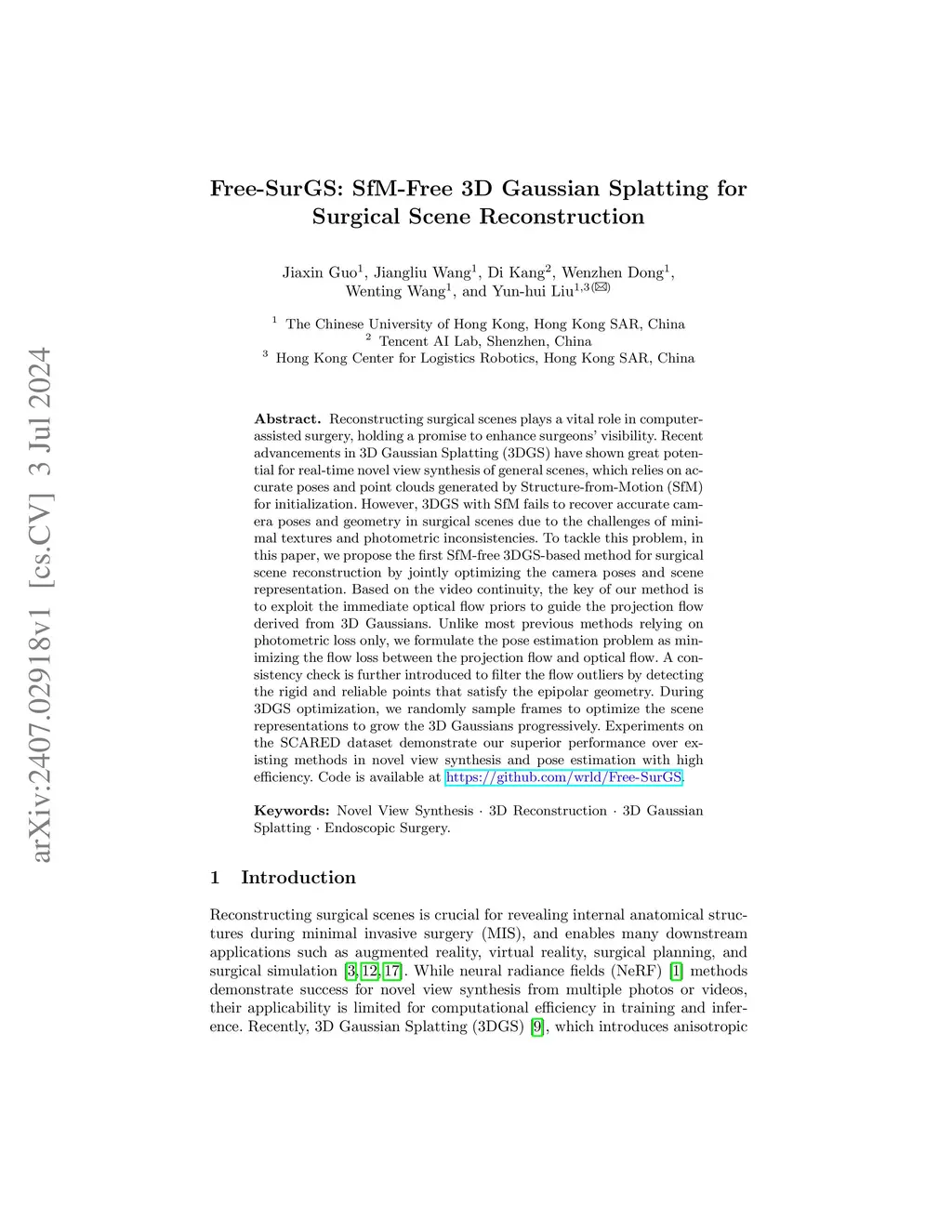 Real-time 3D reconstruction of surgical scenes plays a vital role in computer-assisted surgery, holding a promise to enhance surgeons' visibility. Recent advancements in 3D Gaussian Splatting (3DGS) have shown great potential for real-time novel view synthesis of general scenes, which relies on accurate poses and point clouds generated by Structure-from-Motion (SfM) for initialization. However, 3DGS with SfM fails to recover accurate camera poses and geometry in surgical scenes due to the challenges of minimal textures and photometric inconsistencies. To tackle this problem, in this paper, we propose the first SfM-free 3DGS-based method for surgical scene reconstruction by jointly optimizing the camera poses and scene representation. Based on the video continuity, the key of our method is to exploit the immediate optical flow priors to guide the projection flow derived from 3D Gaussians. Unlike most previous methods relying on photometric loss only, we formulate the pose estimation problem as minimizing the flow loss between the projection flow and optical flow. A consistency check is further introduced to filter the flow outliers by detecting the rigid and reliable points that satisfy the epipolar geometry. During 3D Gaussian optimization, we randomly sample frames to optimize the scene representations to grow the 3D Gaussian progressively. Experiments on the SCARED dataset demonstrate our superior performance over existing methods in novel view synthesis and pose estimation with high efficiency. Code is available at https://github.com/wrld/Free-SurGS.