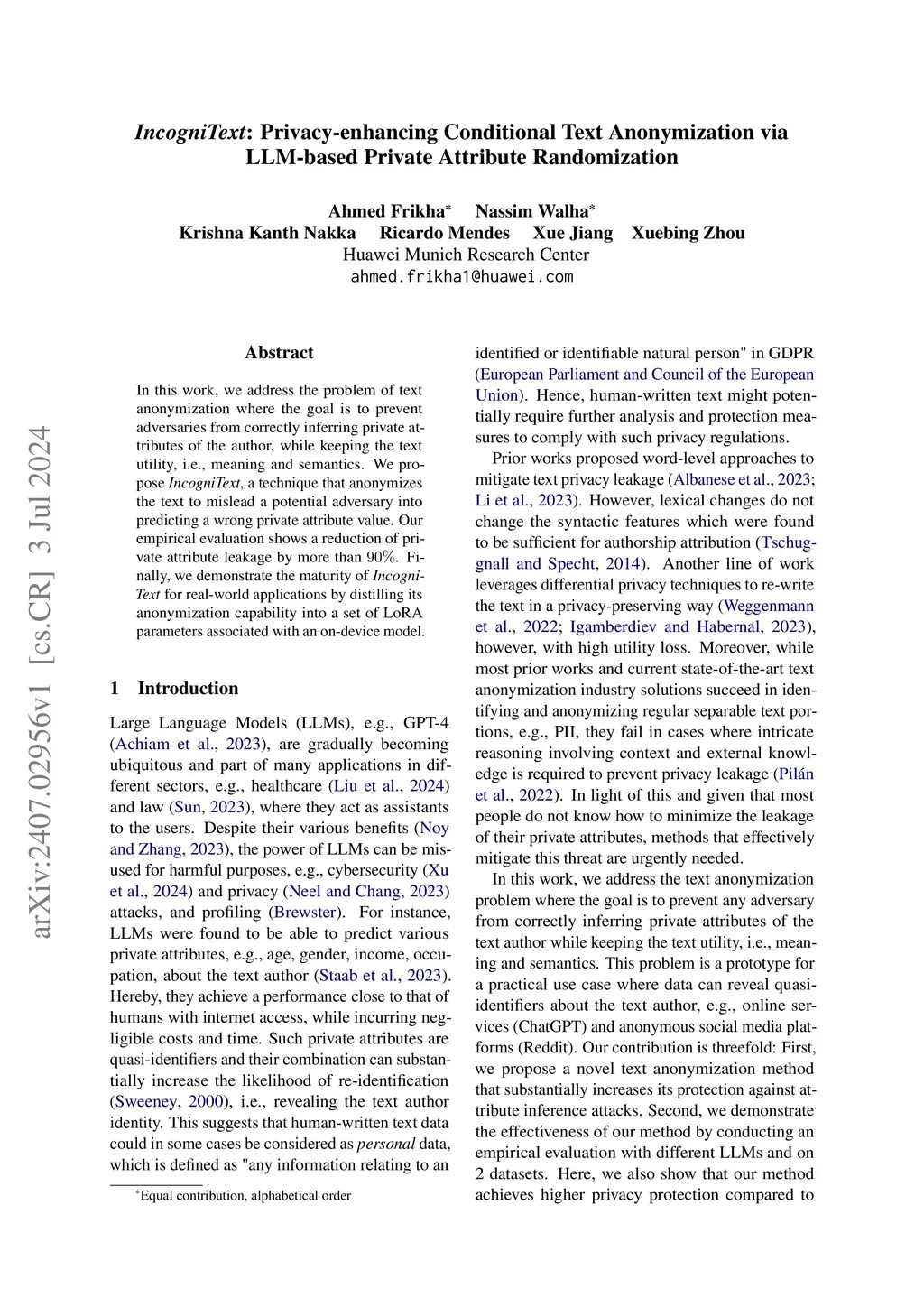 In this work, we address the problem of text anonymization where the goal is to prevent adversaries from correctly inferring private attributes of the author, while keeping the text utility, i.e., meaning and semantics. We propose IncogniText, a technique that anonymizes the text to mislead a potential adversary into predicting a wrong private attribute value. Our empirical evaluation shows a reduction of private attribute leakage by more than 90% across 8 different private attributes. Finally, we demonstrate the maturity of IncogniText for real-world applications by distilling its anonymization capability into a set of LoRA parameters associated with an on-device model. Our results show the possibility of reducing privacy leakage by more than half with limited impact on utility.
