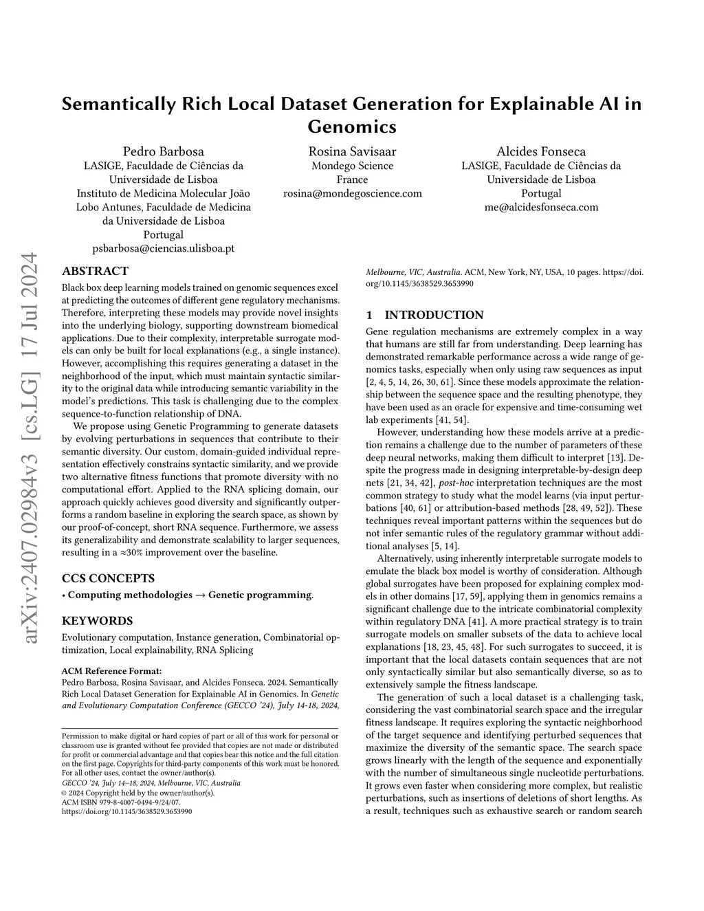 Black box deep learning models trained on genomic sequences excel at predicting the outcomes of different gene regulatory mechanisms. Therefore, interpreting these models may provide novel insights into the underlying biology, supporting downstream biomedical applications. Due to their complexity, interpretable surrogate models can only be built for local explanations (e.g., a single instance). However, accomplishing this requires generating a dataset in the neighborhood of the input, which must maintain syntactic similarity to the original data while introducing semantic variability in the model's predictions. This task is challenging due to the complex sequence-to-function relationship of DNA. We propose using Genetic Programming to generate datasets by evolving perturbations in sequences that contribute to their semantic diversity. Our custom, domain-guided individual representation effectively constrains syntactic similarity, and we provide two alternative fitness functions that promote diversity with no computational effort. Applied to the RNA splicing domain, our approach quickly achieves good diversity and significantly outperforms a random baseline in exploring the search space, as shown by our proof-of-concept, short RNA sequence. Furthermore, we assess its generalizability and demonstrate scalability to larger sequences, resulting in a ~30% improvement over the baseline.