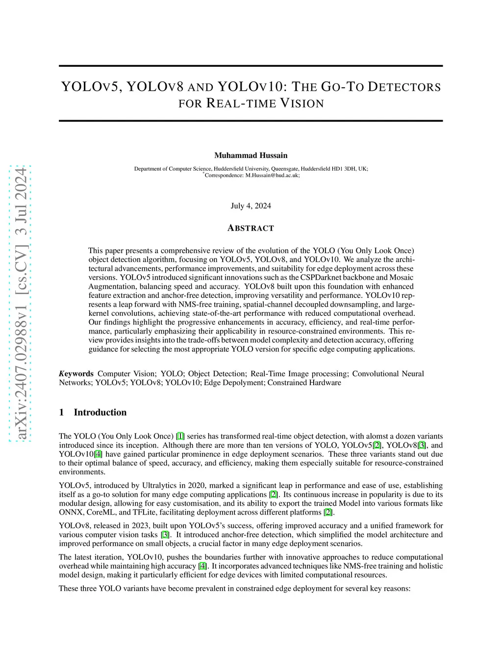 This paper presents a comprehensive review of the evolution of the YOLO (You Only Look Once) object detection algorithm, focusing on YOLOv5, YOLOv8, and YOLOv10. We analyze the architectural advancements, performance improvements, and suitability for edge deployment across these versions. YOLOv5 introduced significant innovations such as the CSPDarknet backbone and Mosaic Augmentation, balancing speed and accuracy. YOLOv8 built upon this foundation with enhanced feature extraction and anchor-free detection, improving versatility and performance. YOLOv10 represents a leap forward with NMS-free training, spatial-channel decoupled downsampling, and large-kernel convolutions, achieving state-of-the-art performance with reduced computational overhead. Our findings highlight the progressive enhancements in accuracy, efficiency, and real-time performance, particularly emphasizing their applicability in resource-constrained environments. This review provides insights into the trade-offs between model complexity and detection accuracy, offering guidance for selecting the most appropriate YOLO version for specific edge computing applications.