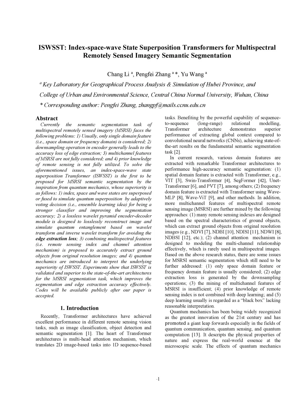 Currently the semantic segmentation task of multispectral remotely sensed imagery (MSRSI) faces the following problems: 1) Usually, only single domain feature (i.e., space domain or frequency domain) is considered; 2) downsampling operation in encoder generally leads to the accuracy loss of edge extraction; 3) multichannel features of MSRSI are not fully considered; and 4) prior knowledge of remote sensing is not fully utilized. To solve the aforementioned issues, an index-space-wave state superposition Transformer (ISWSST) is the first to be proposed for MSRSI semantic segmentation by the inspiration from quantum mechanics, whose superiority is as follows: 1) index, space and wave states are superposed or fused to simulate quantum superposition by adaptively voting decision (i.e., ensemble learning idea) for being a stronger classifier and improving the segmentation accuracy; 2) a lossless wavelet pyramid encoder-decoder module is designed to losslessly reconstruct image and simulate quantum entanglement based on wavelet transform and inverse wavelet transform for avoiding the edge extraction loss; 3) combining multispectral features (i.e. remote sensing index and channel attention mechanism) is proposed to accurately extract ground objects from original resolution images; and 4) quantum mechanics are introduced to interpret the underlying superiority of ISWSST. Experiments show that ISWSST is validated and superior to the state-of-the-art architectures for the MSRSI segmentation task, which improves the segmentation and edge extraction accuracy effectively. Codes will be available publicly after our paper is accepted.