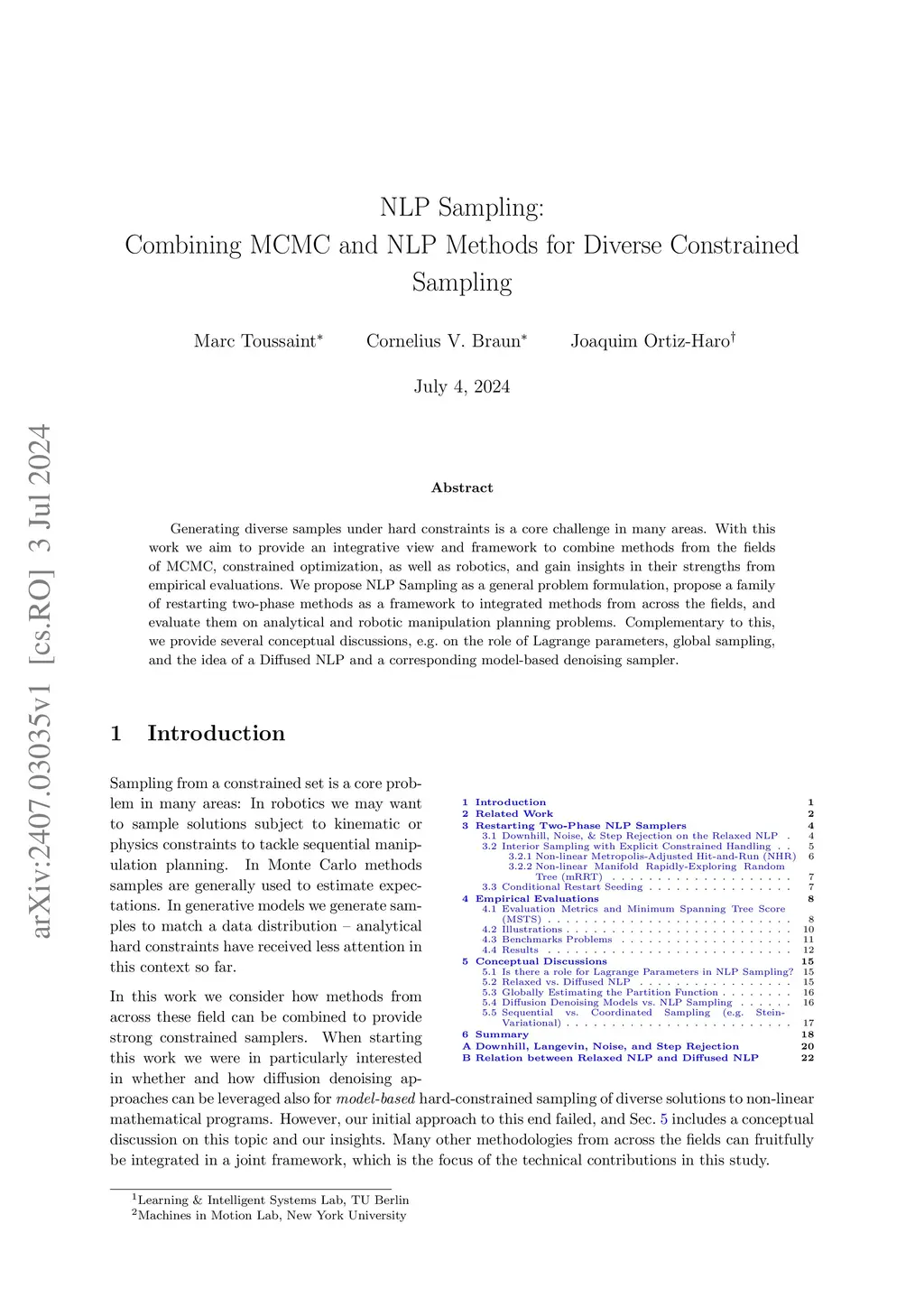 Generating diverse samples under hard constraints is a core challenge in many areas. With this work we aim to provide an integrative view and framework to combine methods from the fields of MCMC, constrained optimization, as well as robotics, and gain insights in their strengths from empirical evaluations. We propose NLP Sampling as a general problem formulation, propose a family of restarting two-phase methods as a framework to integrated methods from across the fields, and evaluate them on analytical and robotic manipulation planning problems. Complementary to this, we provide several conceptual discussions, e.g. on the role of Lagrange parameters, global sampling, and the idea of a Diffused NLP and a corresponding model-based denoising sampler.