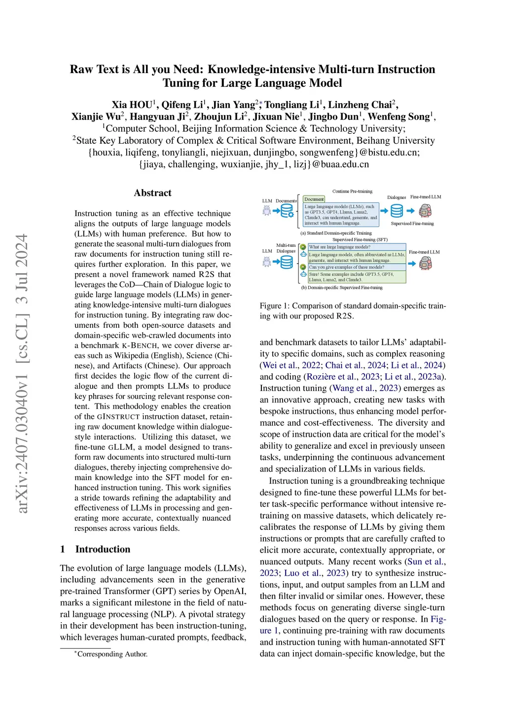 Instruction tuning as an effective technique aligns the outputs of large language models (LLMs) with human preference. But how to generate the seasonal multi-turn dialogues from raw documents for instruction tuning still requires further exploration. In this paper, we present a novel framework named R2S that leverages the CoD-Chain of Dialogue logic to guide large language models (LLMs) in generating knowledge-intensive multi-turn dialogues for instruction tuning. By integrating raw documents from both open-source datasets and domain-specific web-crawled documents into a benchmark K-BENCH, we cover diverse areas such as Wikipedia (English), Science (Chinese), and Artifacts (Chinese). Our approach first decides the logic flow of the current dialogue and then prompts LLMs to produce key phrases for sourcing relevant response content. This methodology enables the creation of the G I NSTRUCT instruction dataset, retaining raw document knowledge within dialoguestyle interactions. Utilizing this dataset, we fine-tune GLLM, a model designed to transform raw documents into structured multi-turn dialogues, thereby injecting comprehensive domain knowledge into the SFT model for enhanced instruction tuning. This work signifies a stride towards refining the adaptability and effectiveness of LLMs in processing and generating more accurate, contextually nuanced responses across various fields.