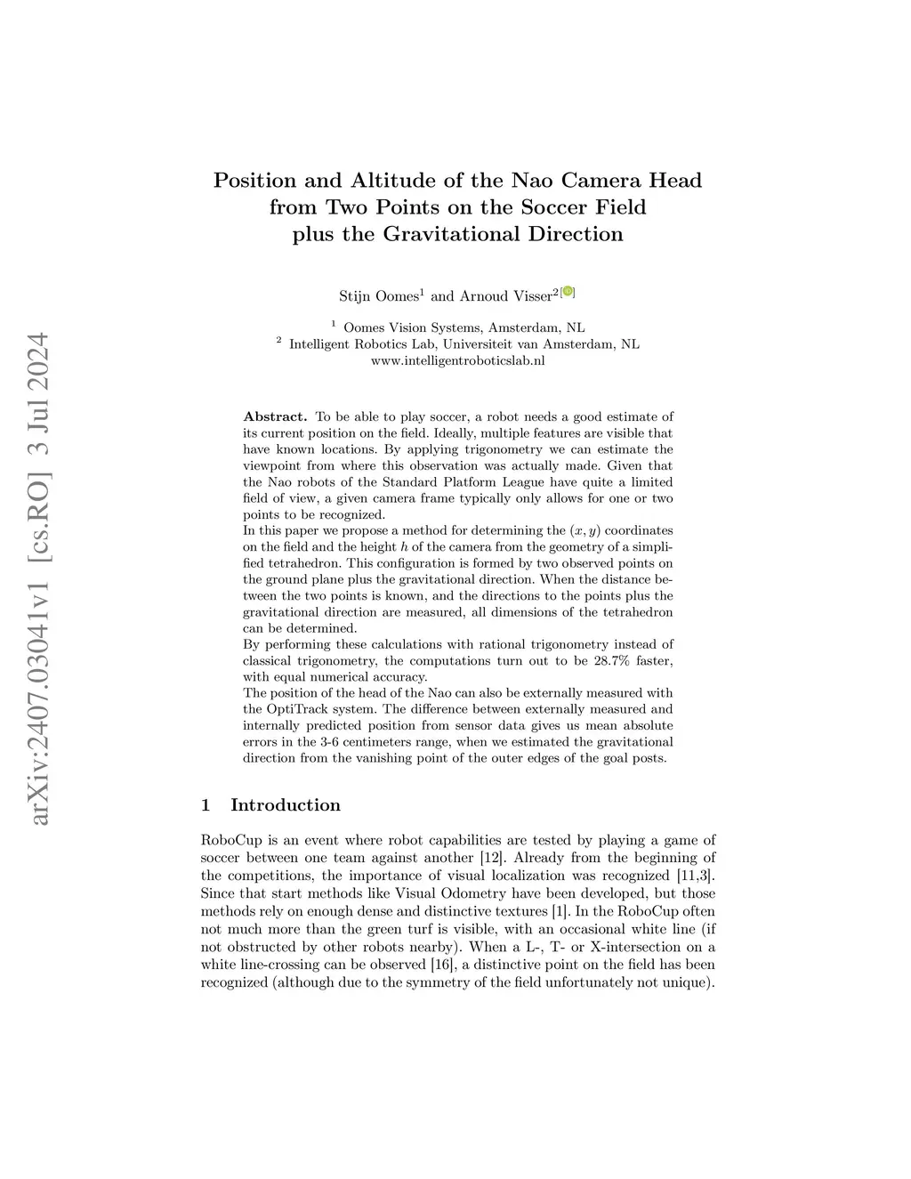 To be able to play soccer, a robot needs a good estimate of its current position on the field. Ideally, multiple features are visible that have known locations. By applying trigonometry we can estimate the viewpoint from where this observation was actually made. Given that the Nao robots of the Standard Platform League have quite a limited field of view, a given camera frame typically only allows for one or two points to be recognized. In this paper we propose a method for determining the (x, y) coordinates on the field and the height h of the camera from the geometry of a simplified tetrahedron. This configuration is formed by two observed points on the ground plane plus the gravitational direction. When the distance between the two points is known, and the directions to the points plus the gravitational direction are measured, all dimensions of the tetrahedron can be determined. By performing these calculations with rational trigonometry instead of classical trigonometry, the computations turn out to be 28.7% faster, with equal numerical accuracy. The position of the head of the Nao can also be externally measured with the OptiTrack system. The difference between externally measured and internally predicted position from sensor data gives us mean absolute errors in the 3-6 centimeters range, when we estimated the gravitational direction from the vanishing point of the outer edges of the goal posts.