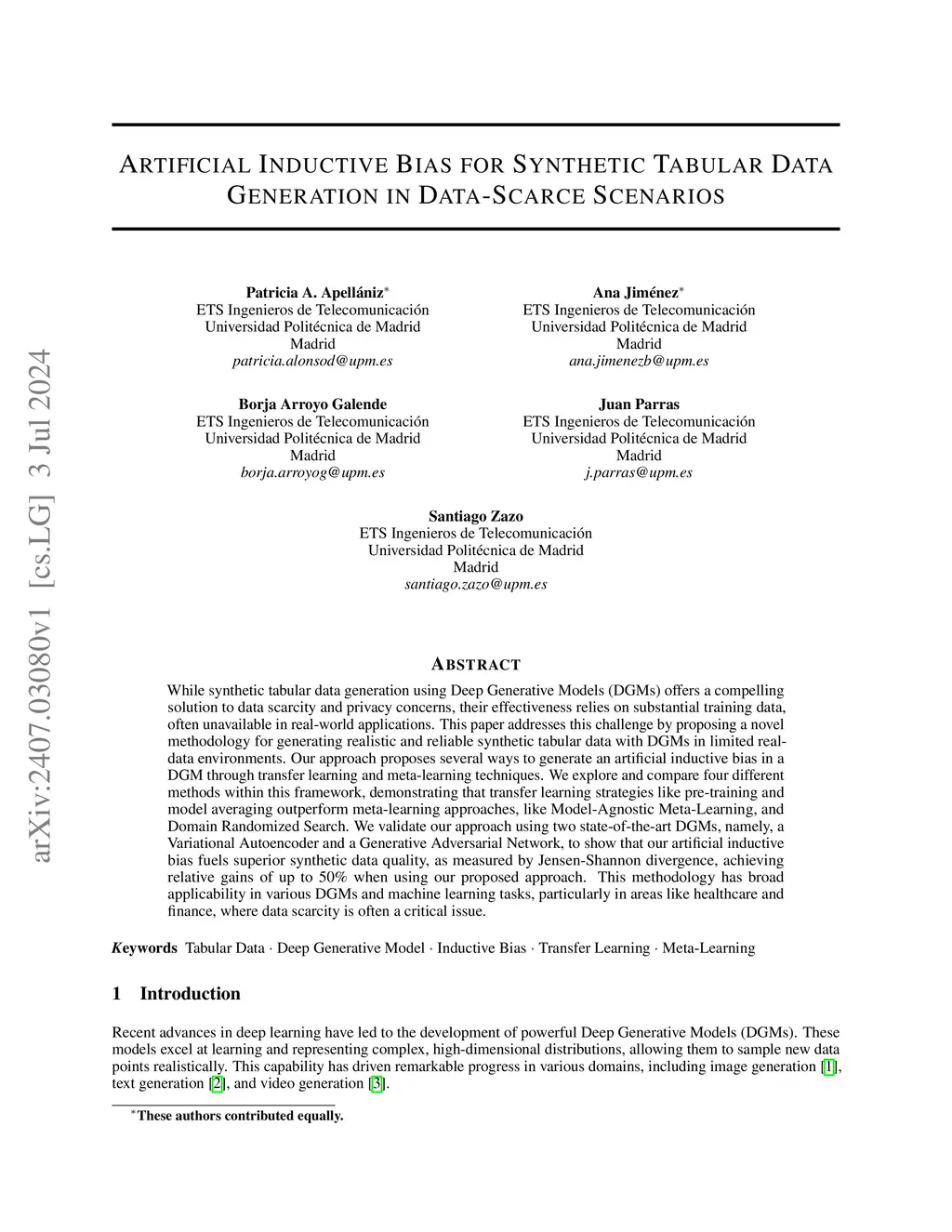 While synthetic tabular data generation using Deep Generative Models (DGMs) offers a compelling solution to data scarcity and privacy concerns, their effectiveness relies on the availability of substantial training data, often lacking in real-world scenarios. To overcome this limitation, we propose a novel methodology that explicitly integrates artificial inductive biases into the generative process to improve data quality in low-data regimes. Our framework leverages transfer learning and meta-learning techniques to construct and inject informative inductive biases into DGMs. We evaluate four approaches (pre-training, model averaging, Model-Agnostic Meta-Learning (MAML), and Domain Randomized Search (DRS)) and analyze their impact on the quality of the generated text. Experimental results show that incorporating inductive bias substantially improves performance, with transfer learning methods outperforming meta-learning, achieving up to 60\% gains in Jensen-Shannon divergence. The methodology is model-agnostic and especially relevant in domains such as healthcare and finance, where high-quality synthetic data are essential, and data availability is often limited.