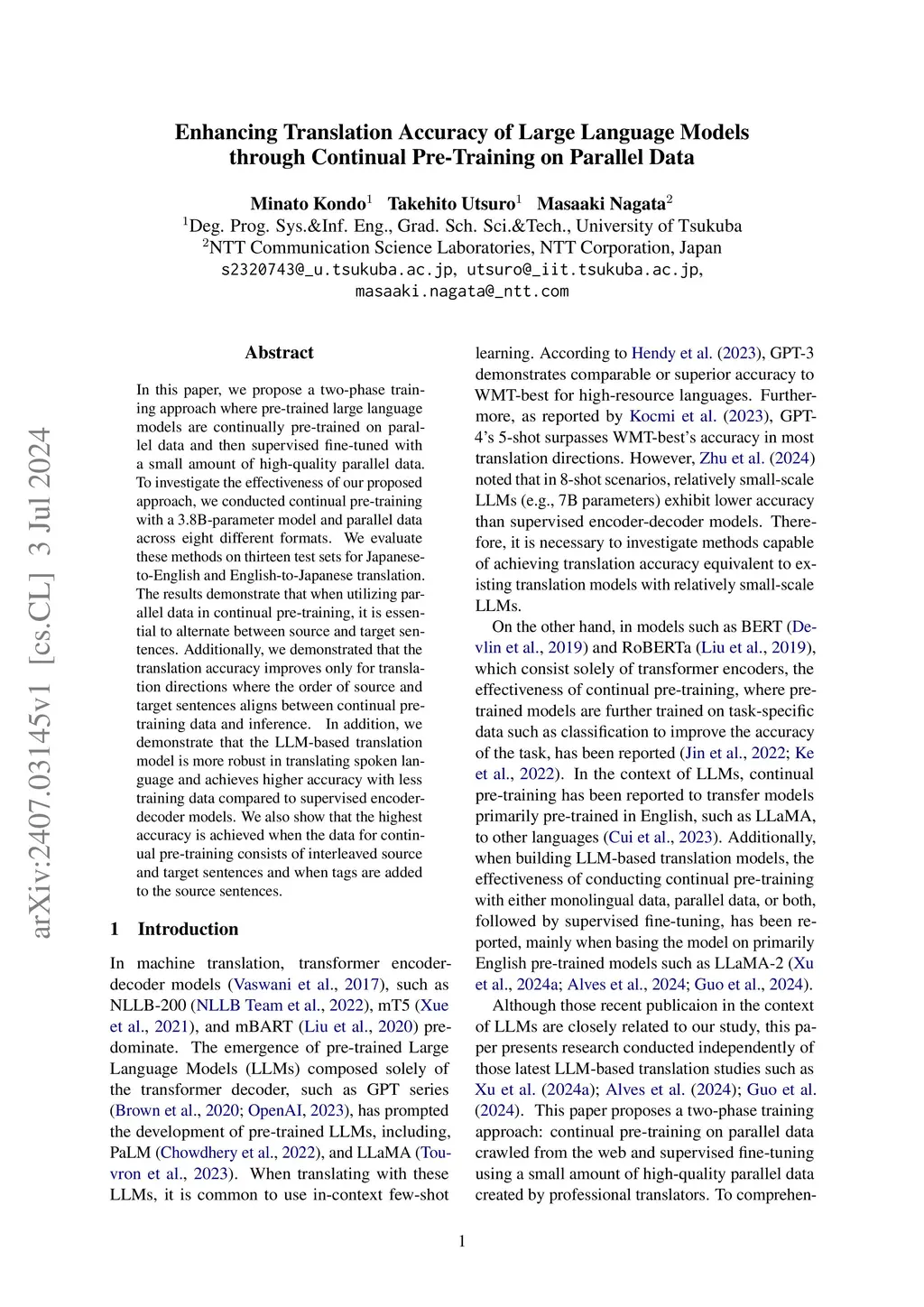 In this paper, we propose a two-phase training approach where pre-trained large language models are continually pre-trained on parallel data and then supervised fine-tuned with a small amount of high-quality parallel data. To investigate the effectiveness of our proposed approach, we conducted continual pre-training with a 3.8B-parameter model and parallel data across eight different formats. We evaluate these methods on thirteen test sets for Japanese-to-English and English-to-Japanese translation. The results demonstrate that when utilizing parallel data in continual pre-training, it is essential to alternate between source and target sentences. Additionally, we demonstrated that the translation accuracy improves only for translation directions where the order of source and target sentences aligns between continual pre-training data and inference. In addition, we demonstrate that the LLM-based translation model is more robust in translating spoken language and achieves higher accuracy with less training data compared to supervised encoder-decoder models. We also show that the highest accuracy is achieved when the data for continual pre-training consists of interleaved source and target sentences and when tags are added to the source sentences.