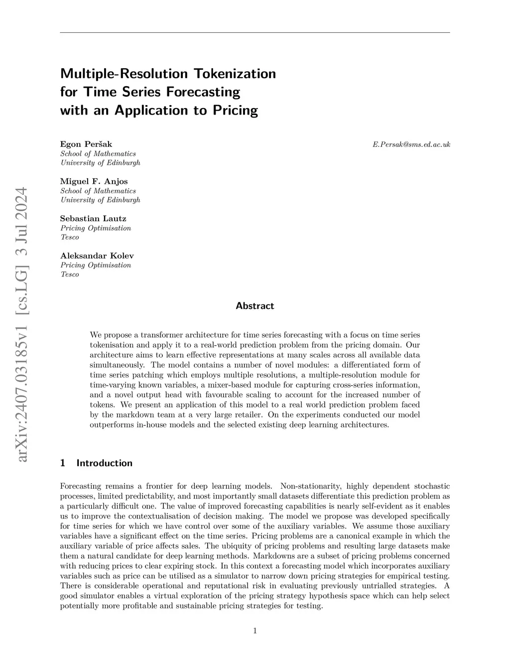 We propose a transformer architecture for time series forecasting with a focus on time series tokenisation and apply it to a real-world prediction problem from the pricing domain. Our architecture aims to learn effective representations at many scales across all available data simultaneously. The model contains a number of novel modules: a differentiated form of time series patching which employs multiple resolutions, a multiple-resolution module for time-varying known variables, a mixer-based module for capturing cross-series information, and a novel output head with favourable scaling to account for the increased number of tokens. We present an application of this model to a real world prediction problem faced by the markdown team at a very large retailer. On the experiments conducted our model outperforms in-house models and the selected existing deep learning architectures.