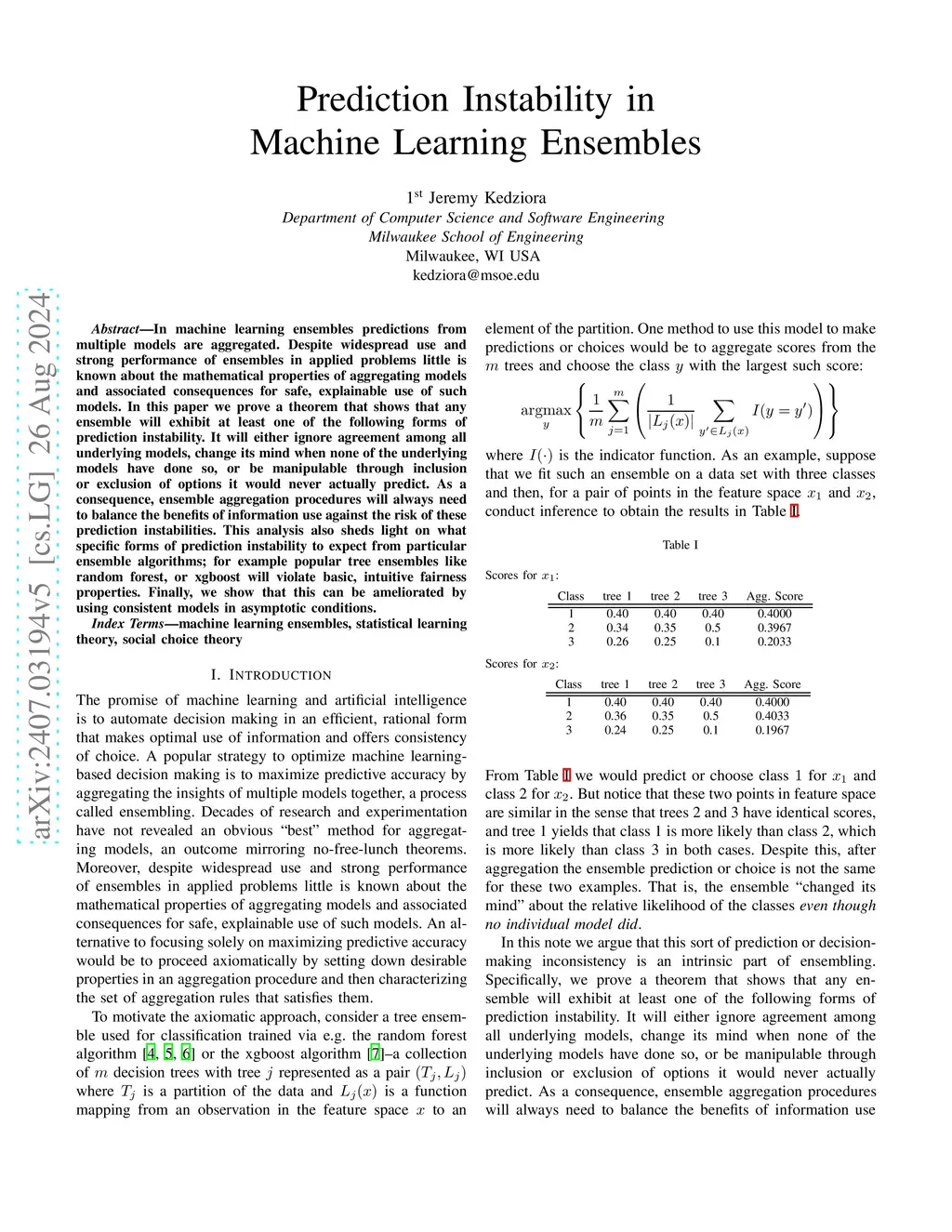 In machine learning ensembles predictions from multiple models are aggregated. Despite widespread use and strong performance of ensembles in applied problems little is known about the mathematical properties of aggregating models and associated consequences for safe, explainable use of such models. In this paper we prove a theorem that shows that any ensemble will exhibit at least one of the following forms of prediction instability. It will either ignore agreement among all underlying models, change its mind when none of the underlying models have done so, or be manipulable through inclusion or exclusion of options it would never actually predict. As a consequence, ensemble aggregation procedures will always need to balance the benefits of information use against the risk of these prediction instabilities. This analysis also sheds light on what specific forms of prediction instability to expect from particular ensemble algorithms; for example popular tree ensembles like random forest, or xgboost will violate basic, intuitive fairness properties. Finally, we show that this can be ameliorated by using consistent models in asymptotic conditions.