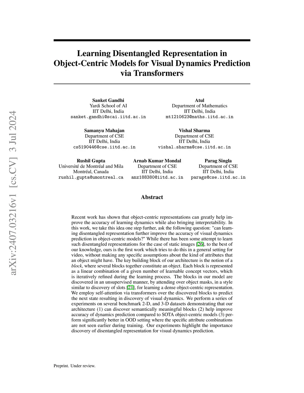 Recent work has shown that object-centric representations can greatly help improve the accuracy of learning dynamics while also bringing interpretability. In this work, we take this idea one step further, ask the following question: "can learning disentangled representation further improve the accuracy of visual dynamics prediction in object-centric models?" While there has been some attempt to learn such disentangled representations for the case of static images \citep{nsb}, to the best of our knowledge, ours is the first work which tries to do this in a general setting for video, without making any specific assumptions about the kind of attributes that an object might have. The key building block of our architecture is the notion of a {\em block}, where several blocks together constitute an object. Each block is represented as a linear combination of a given number of learnable concept vectors, which is iteratively refined during the learning process. The blocks in our model are discovered in an unsupervised manner, by attending over object masks, in a style similar to discovery of slots \citep{slot_attention}, for learning a dense object-centric representation. We employ self-attention via transformers over the discovered blocks to predict the next state resulting in discovery of visual dynamics. We perform a series of experiments on several benchmark 2-D, and 3-D datasets demonstrating that our architecture (1) can discover semantically meaningful blocks (2) help improve accuracy of dynamics prediction compared to SOTA object-centric models (3) perform significantly better in OOD setting where the specific attribute combinations are not seen earlier during training. Our experiments highlight the importance discovery of disentangled representation for visual dynamics prediction.