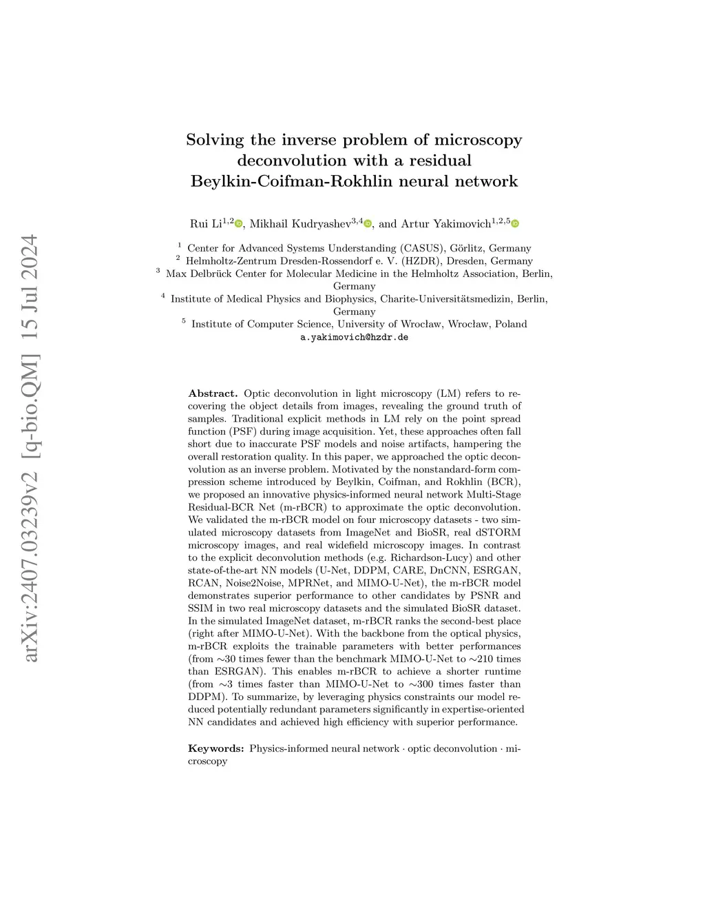 Optic deconvolution in light microscopy (LM) refers to recovering the object details from images, revealing the ground truth of samples. Traditional explicit methods in LM rely on the point spread function (PSF) during image acquisition. Yet, these approaches often fall short due to inaccurate PSF models and noise artifacts, hampering the overall restoration quality. In this paper, we approached the optic deconvolution as an inverse problem. Motivated by the nonstandard-form compression scheme introduced by Beylkin, Coifman, and Rokhlin (BCR), we proposed an innovative physics-informed neural network Multi-Stage Residual-BCR Net (m-rBCR) to approximate the optic deconvolution. We validated the m-rBCR model on four microscopy datasets - two simulated microscopy datasets from ImageNet and BioSR, real dSTORM microscopy images, and real widefield microscopy images. In contrast to the explicit deconvolution methods (e.g. Richardson-Lucy) and other state-of-the-art NN models (U-Net, DDPM, CARE, DnCNN, ESRGAN, RCAN, Noise2Noise, MPRNet, and MIMO-U-Net), the m-rBCR model demonstrates superior performance to other candidates by PSNR and SSIM in two real microscopy datasets and the simulated BioSR dataset. In the simulated ImageNet dataset, m-rBCR ranks the second-best place (right after MIMO-U-Net). With the backbone from the optical physics, m-rBCR exploits the trainable parameters with better performances (from ~30 times fewer than the benchmark MIMO-U-Net to ~210 times than ESRGAN). This enables m-rBCR to achieve a shorter runtime (from ~3 times faster than MIMO-U-Net to ~300 times faster than DDPM). To summarize, by leveraging physics constraints our model reduced potentially redundant parameters significantly in expertise-oriented NN candidates and achieved high efficiency with superior performance.