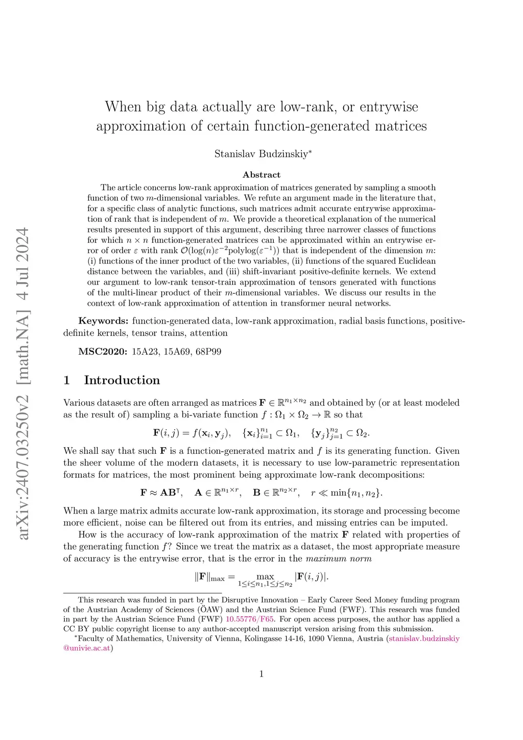The article concerns low-rank approximation of matrices generated by sampling a smooth function of two -dimensional variables. We identify several misconceptions surrounding a claim that, for a specific class of analytic functions, such matrices admit accurate entrywise approximation of rank that is independent of and grows as -- colloquially known as ''big-data matrices are approximately low-rank''. We provide a theoretical explanation of the numerical results presented in support of this claim, describing three narrower classes of functions for which function-generated matrices can be approximated within an entrywise error of order with rank that is independent of the dimension : (i) functions of the inner product of the two variables, (ii) functions of the Euclidean distance between the variables, and (iii) shift-invariant positive-definite kernels. We extend our argument to tensor-train approximation of tensors generated with functions of the ''higher-order inner product'' of their multiple variables. We discuss our results in the context of low-rank approximation of (a) growing datasets and (b) attention in transformer neural networks.