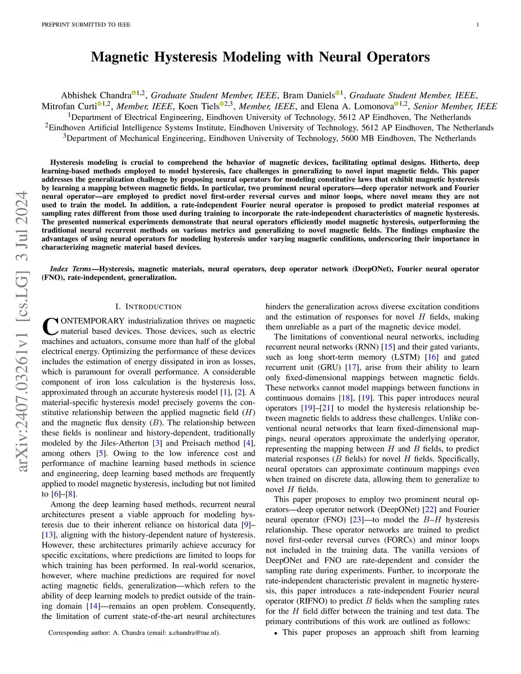 Hysteresis modeling is crucial to comprehend the behavior of magnetic devices, facilitating optimal designs. Hitherto, deep learning-based methods employed to model hysteresis, face challenges in generalizing to novel input magnetic fields. This paper addresses the generalization challenge by proposing neural operators for modeling constitutive laws that exhibit magnetic hysteresis by learning a mapping between magnetic fields. In particular, two prominent neural operators -- deep operator network and Fourier neural operator -- are employed to predict novel first-order reversal curves and minor loops, where novel means they are not used to train the model. In addition, a rate-independent Fourier neural operator is proposed to predict material responses at sampling rates different from those used during training to incorporate the rate-independent characteristics of magnetic hysteresis. The presented numerical experiments demonstrate that neural operators efficiently model magnetic hysteresis, outperforming the traditional neural recurrent methods on various metrics and generalizing to novel magnetic fields. The findings emphasize the advantages of using neural operators for modeling hysteresis under varying magnetic conditions, underscoring their importance in characterizing magnetic material based devices.