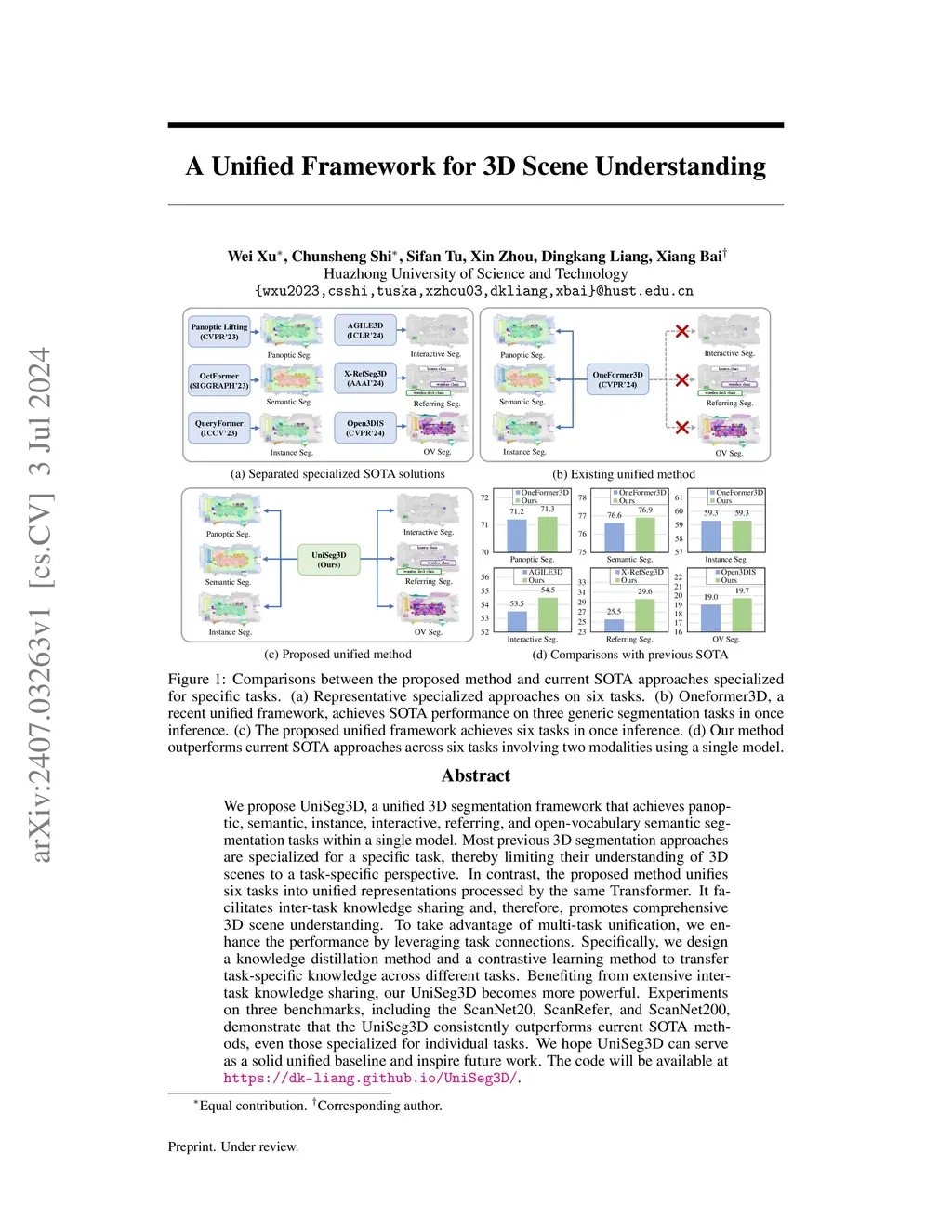 We propose UniSeg3D, a unified 3D segmentation framework that achieves panoptic, semantic, instance, interactive, referring, and open-vocabulary semantic segmentation tasks within a single model. Most previous 3D segmentation approaches are specialized for a specific task, thereby limiting their understanding of 3D scenes to a task-specific perspective. In contrast, the proposed method unifies six tasks into unified representations processed by the same Transformer. It facilitates inter-task knowledge sharing and, therefore, promotes comprehensive 3D scene understanding. To take advantage of multi-task unification, we enhance the performance by leveraging task connections. Specifically, we design a knowledge distillation method and a contrastive learning method to transfer task-specific knowledge across different tasks. Benefiting from extensive inter-task knowledge sharing, our UniSeg3D becomes more powerful. Experiments on three benchmarks, including the ScanNet20, ScanRefer, and ScanNet200, demonstrate that the UniSeg3D consistently outperforms current SOTA methods, even those specialized for individual tasks. We hope UniSeg3D can serve as a solid unified baseline and inspire future work. The code will be available at https://dk-liang.github.io/UniSeg3D/.
