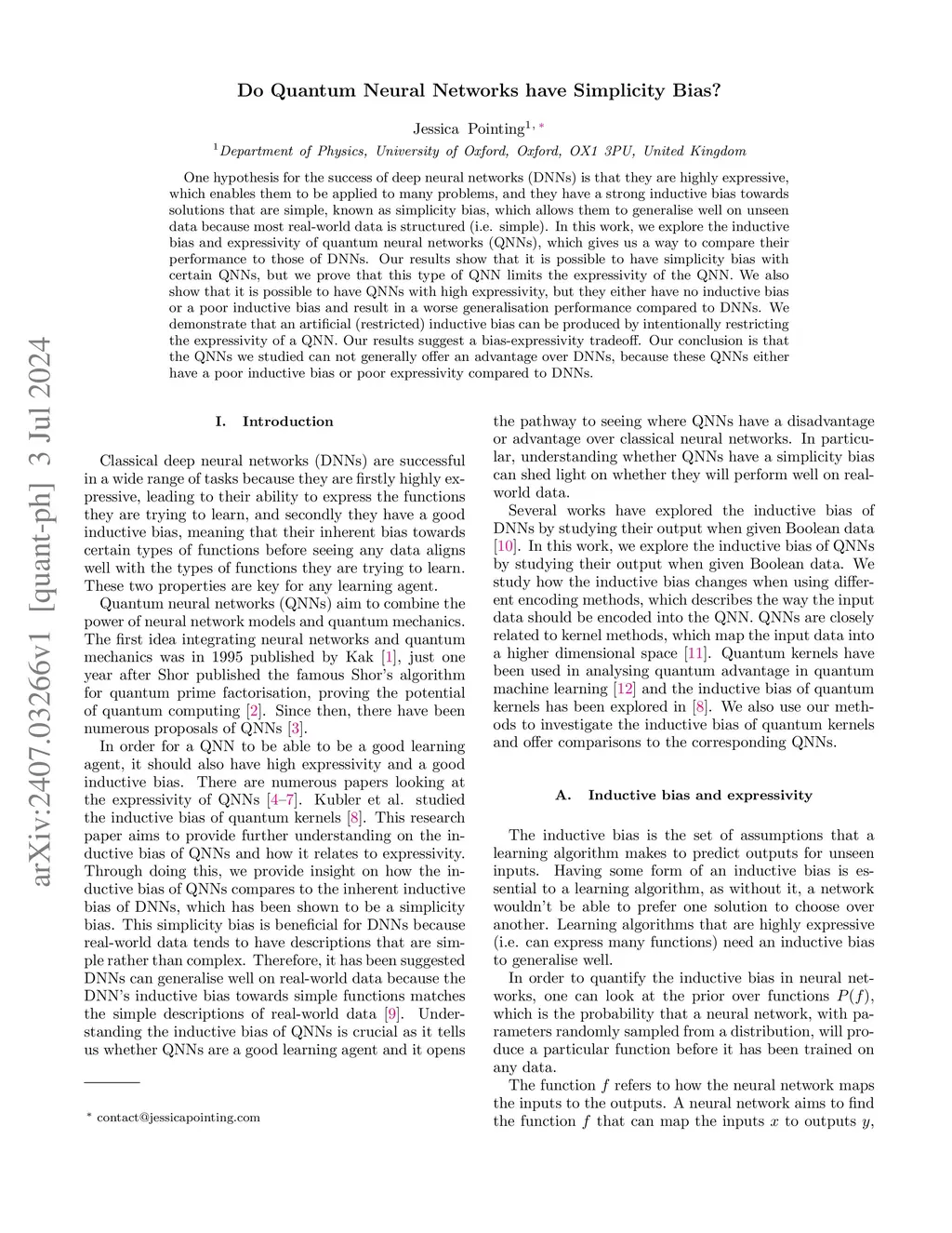 One hypothesis for the success of deep neural networks (DNNs) is that they are highly expressive, which enables them to be applied to many problems, and they have a strong inductive bias towards solutions that are simple, known as simplicity bias, which allows them to generalise well on unseen data because most real-world data is structured (i.e. simple). In this work, we explore the inductive bias and expressivity of quantum neural networks (QNNs), which gives us a way to compare their performance to those of DNNs. Our results show that it is possible to have simplicity bias with certain QNNs, but we prove that this type of QNN limits the expressivity of the QNN. We also show that it is possible to have QNNs with high expressivity, but they either have no inductive bias or a poor inductive bias and result in a worse generalisation performance compared to DNNs. We demonstrate that an artificial (restricted) inductive bias can be produced by intentionally restricting the expressivity of a QNN. Our results suggest a bias-expressivity tradeoff. Our conclusion is that the QNNs we studied can not generally offer an advantage over DNNs, because these QNNs either have a poor inductive bias or poor expressivity compared to DNNs.