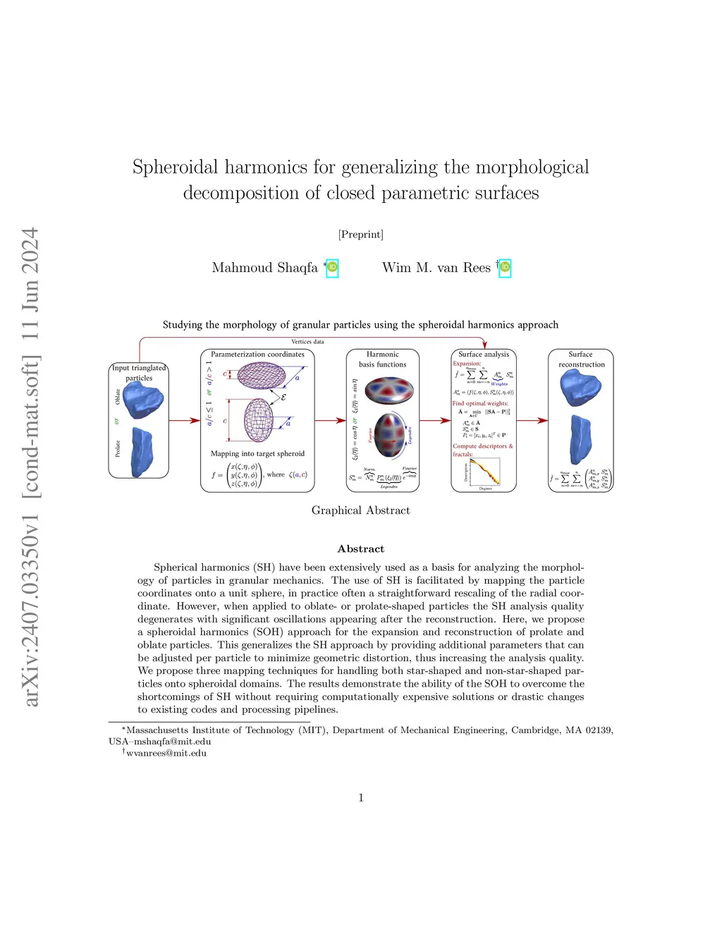 Spherical harmonics (SH) have been extensively used as a basis for analyzing the morphology of particles in granular mechanics. The use of SH is facilitated by mapping the particle coordinates onto a unit sphere, in practice often a straightforward rescaling of the radial coordinate. However, when applied to oblate- or prolate-shaped particles the SH analysis quality degenerates with significant oscillations appearing after the reconstruction. Here, we propose a spheroidal harmonics (SOH) approach for the expansion and reconstruction of prolate and oblate particles. This generalizes the SH approach by providing additional parameters that can be adjusted per particle to minimize geometric distortion, thus increasing the analysis quality. We propose three mapping techniques for handling both star-shaped and non-star-shaped particles onto spheroidal domains. The results demonstrate the ability of the SOH to overcome the shortcomings of SH without requiring computationally expensive solutions or drastic changes to existing codes and processing pipelines.