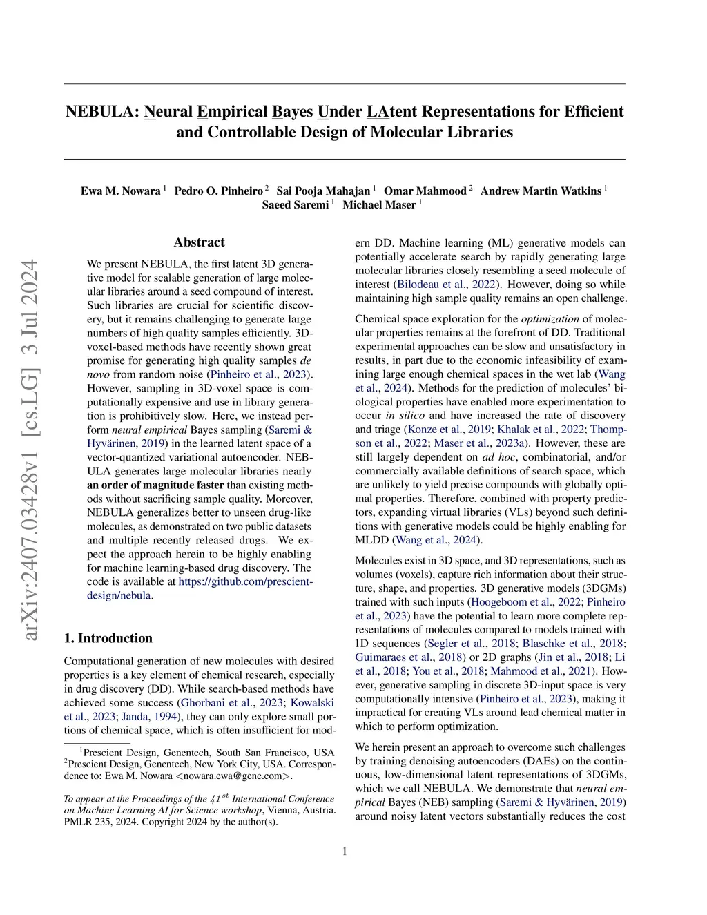 We present NEBULA, the first latent 3D generative model for scalable generation of large molecular libraries around a seed compound of interest. Such libraries are crucial for scientific discovery, but it remains challenging to generate large numbers of high quality samples efficiently. 3D-voxel-based methods have recently shown great promise for generating high quality samples de novo from random noise (Pinheiro et al., 2023). However, sampling in 3D-voxel space is computationally expensive and use in library generation is prohibitively slow. Here, we instead perform neural empirical Bayes sampling (Saremi & Hyvarinen, 2019) in the learned latent space of a vector-quantized variational autoencoder. NEBULA generates large molecular libraries nearly an order of magnitude faster than existing methods without sacrificing sample quality. Moreover, NEBULA generalizes better to unseen drug-like molecules, as demonstrated on two public datasets and multiple recently released drugs. We expect the approach herein to be highly enabling for machine learning-based drug discovery. The code is available at https://github.com/prescient-design/nebula