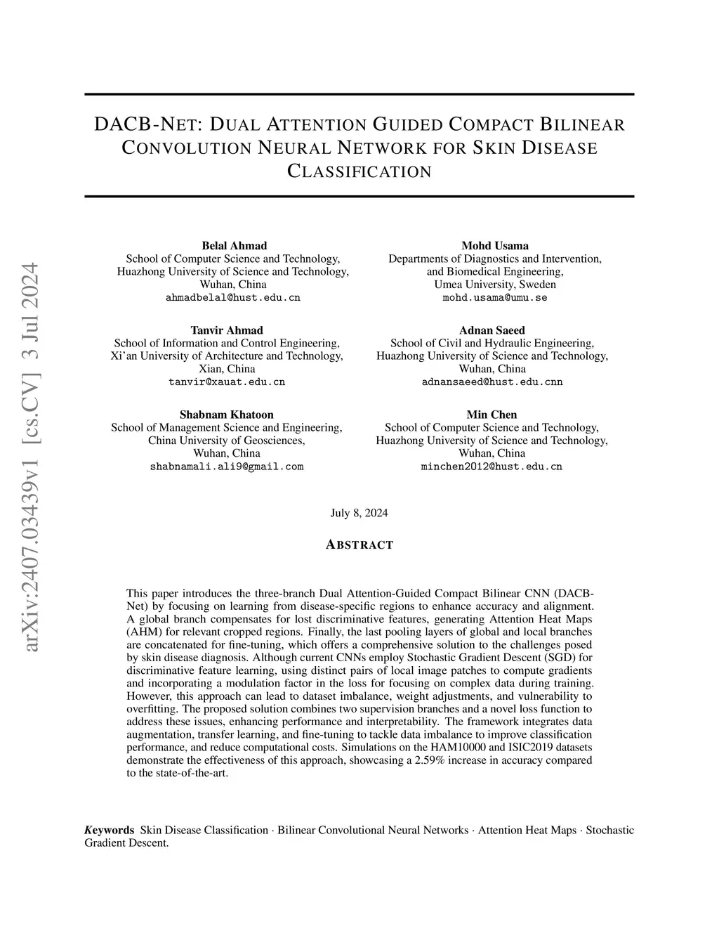 This paper introduces the three-branch Dual Attention-Guided Compact Bilinear CNN (DACB-Net) by focusing on learning from disease-specific regions to enhance accuracy and alignment. A global branch compensates for lost discriminative features, generating Attention Heat Maps (AHM) for relevant cropped regions. Finally, the last pooling layers of global and local branches are concatenated for fine-tuning, which offers a comprehensive solution to the challenges posed by skin disease diagnosis. Although current CNNs employ Stochastic Gradient Descent (SGD) for discriminative feature learning, using distinct pairs of local image patches to compute gradients and incorporating a modulation factor in the loss for focusing on complex data during training. However, this approach can lead to dataset imbalance, weight adjustments, and vulnerability to overfitting. The proposed solution combines two supervision branches and a novel loss function to address these issues, enhancing performance and interpretability. The framework integrates data augmentation, transfer learning, and fine-tuning to tackle data imbalance to improve classification performance, and reduce computational costs. Simulations on the HAM10000 and ISIC2019 datasets demonstrate the effectiveness of this approach, showcasing a 2.59% increase in accuracy compared to the state-of-the-art.