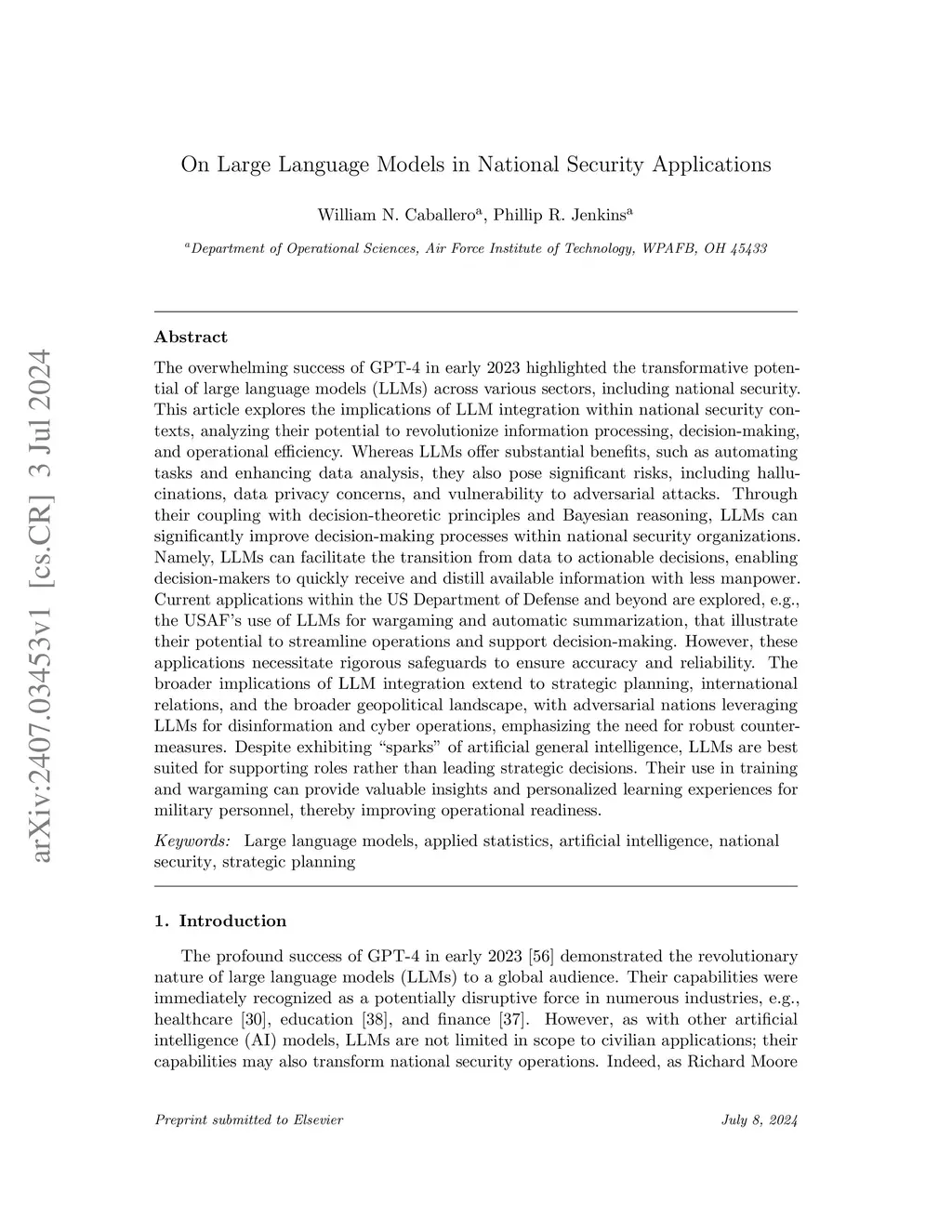 The overwhelming success of GPT-4 in early 2023 highlighted the transformative potential of large language models (LLMs) across various sectors, including national security. This article explores the implications of LLM integration within national security contexts, analyzing their potential to revolutionize information processing, decision-making, and operational efficiency. Whereas LLMs offer substantial benefits, such as automating tasks and enhancing data analysis, they also pose significant risks, including hallucinations, data privacy concerns, and vulnerability to adversarial attacks. Through their coupling with decision-theoretic principles and Bayesian reasoning, LLMs can significantly improve decision-making processes within national security organizations. Namely, LLMs can facilitate the transition from data to actionable decisions, enabling decision-makers to quickly receive and distill available information with less manpower. Current applications within the US Department of Defense and beyond are explored, e.g., the USAF's use of LLMs for wargaming and automatic summarization, that illustrate their potential to streamline operations and support decision-making. However, these applications necessitate rigorous safeguards to ensure accuracy and reliability. The broader implications of LLM integration extend to strategic planning, international relations, and the broader geopolitical landscape, with adversarial nations leveraging LLMs for disinformation and cyber operations, emphasizing the need for robust countermeasures. Despite exhibiting "sparks" of artificial general intelligence, LLMs are best suited for supporting roles rather than leading strategic decisions. Their use in training and wargaming can provide valuable insights and personalized learning experiences for military personnel, thereby improving operational readiness.