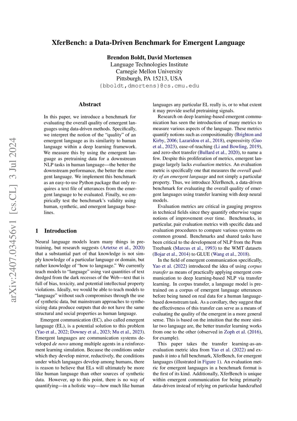 XferBench: a Data-Driven Benchmark for Emergent Language