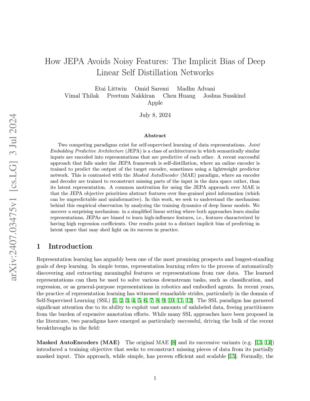 Two competing paradigms exist for self-supervised learning of data representations. Joint Embedding Predictive Architecture (JEPA) is a class of architectures in which semantically similar inputs are encoded into representations that are predictive of each other. A recent successful approach that falls under the JEPA framework is self-distillation, where an online encoder is trained to predict the output of the target encoder, sometimes using a lightweight predictor network. This is contrasted with the Masked AutoEncoder (MAE) paradigm, where an encoder and decoder are trained to reconstruct missing parts of the input in the data space rather, than its latent representation. A common motivation for using the JEPA approach over MAE is that the JEPA objective prioritizes abstract features over fine-grained pixel information (which can be unpredictable and uninformative). In this work, we seek to understand the mechanism behind this empirical observation by analyzing the training dynamics of deep linear models. We uncover a surprising mechanism: in a simplified linear setting where both approaches learn similar representations, JEPAs are biased to learn high-influence features, i.e., features characterized by having high regression coefficients. Our results point to a distinct implicit bias of predicting in latent space that may shed light on its success in practice.