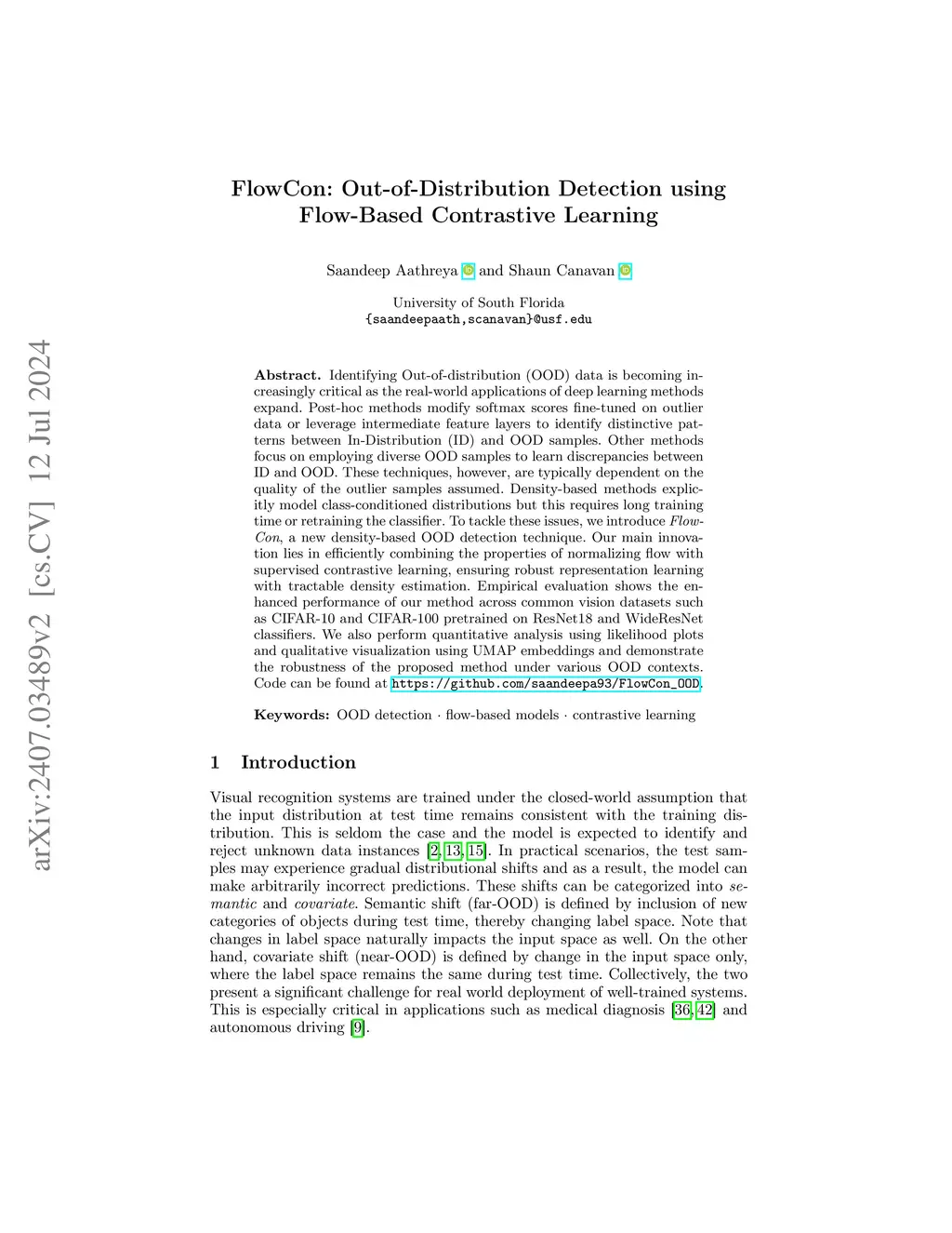 Identifying Out-of-distribution (OOD) data is becoming increasingly critical as the real-world applications of deep learning methods expand. Post-hoc methods modify softmax scores fine-tuned on outlier data or leverage intermediate feature layers to identify distinctive patterns between In-Distribution (ID) and OOD samples. Other methods focus on employing diverse OOD samples to learn discrepancies between ID and OOD. These techniques, however, are typically dependent on the quality of the outlier samples assumed. Density-based methods explicitly model class-conditioned distributions but this requires long training time or retraining the classifier. To tackle these issues, we introduce \textit{FlowCon}, a new density-based OOD detection technique. Our main innovation lies in efficiently combining the properties of normalizing flow with supervised contrastive learning, ensuring robust representation learning with tractable density estimation. Empirical evaluation shows the enhanced performance of our method across common vision datasets such as CIFAR-10 and CIFAR-100 pretrained on ResNet18 and WideResNet classifiers. We also perform quantitative analysis using likelihood plots and qualitative visualization using UMAP embeddings and demonstrate the robustness of the proposed method under various OOD contexts. Code will be open-sourced post decision.