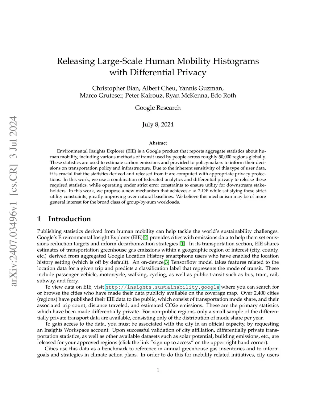 Environmental Insights Explorer (EIE) is a Google product that reports aggregate statistics about human mobility, including various methods of transit used by people across roughly 50,000 regions globally. These statistics are used to estimate carbon emissions and provided to policymakers to inform their decisions on transportation policy and infrastructure. Due to the inherent sensitivity of this type of user data, it is crucial that the statistics derived and released from it are computed with appropriate privacy protections. In this work, we use a combination of federated analytics and differential privacy to release these required statistics, while operating under strict error constraints to ensure utility for downstream stakeholders. In this work, we propose a new mechanism that achieves $ \epsilon \approx 2 $-DP while satisfying these strict utility constraints, greatly improving over natural baselines. We believe this mechanism may be of more general interest for the broad class of group-by-sum workloads.