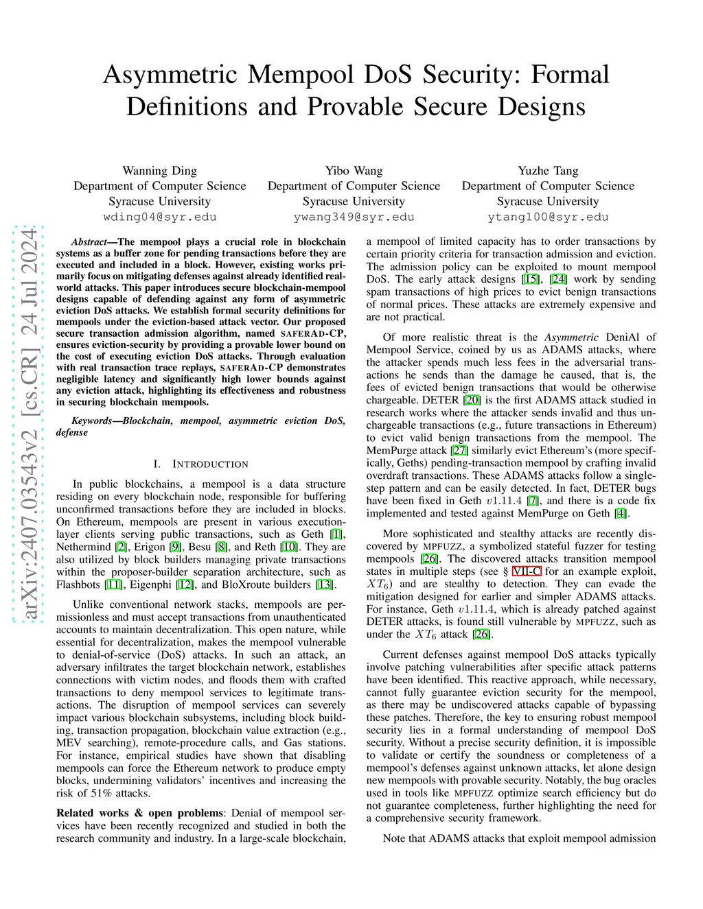 Asymmetric Mempool DoS Security: Formal Definitions and Provable Secure