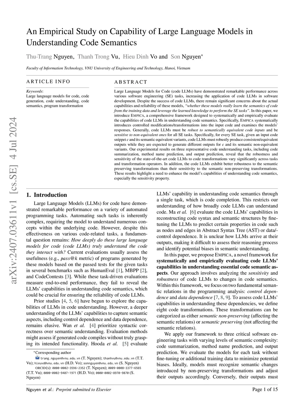 Large Language Models for Code (code LLMs) have demonstrated remarkable performance across various software engineering (SE) tasks, increasing the application of code LLMs in software development. Despite the success of code LLMs, there remain significant concerns about the actual capabilities and reliability of these models, "whether these models really learn the semantics of code from the training data and leverage the learned knowledge to perform the SE tasks". In this paper, we introduce EMPICA, a comprehensive framework designed to systematically and empirically evaluate the capabilities of code LLMs in understanding code semantics. Specifically, EMPICA systematically introduces controlled modifications/transformations into the input code and examines the models' responses. Generally, code LLMs must be robust to semantically equivalent code inputs and be sensitive to non-equivalent ones for all SE tasks. Specifically, for every SE task, given an input code snippet c and its semantic equivalent variants, code LLMs must robustly produce consistent/equivalent outputs while they are expected to generate different outputs for c and its semantic non-equivalent variants. Our experimental results on three representative code understanding tasks, including code summarization, method name prediction, and output prediction, reveal that the robustness and sensitivity of the state-of-the-art code LLMs to code transformations vary significantly across tasks and transformation operators. In addition, the code LLMs exhibit better robustness to the semantic preserving transformations than their sensitivity to the semantic non-preserving transformations. These results highlight a need to enhance the model's capabilities of understanding code semantics, especially the sensitivity property.