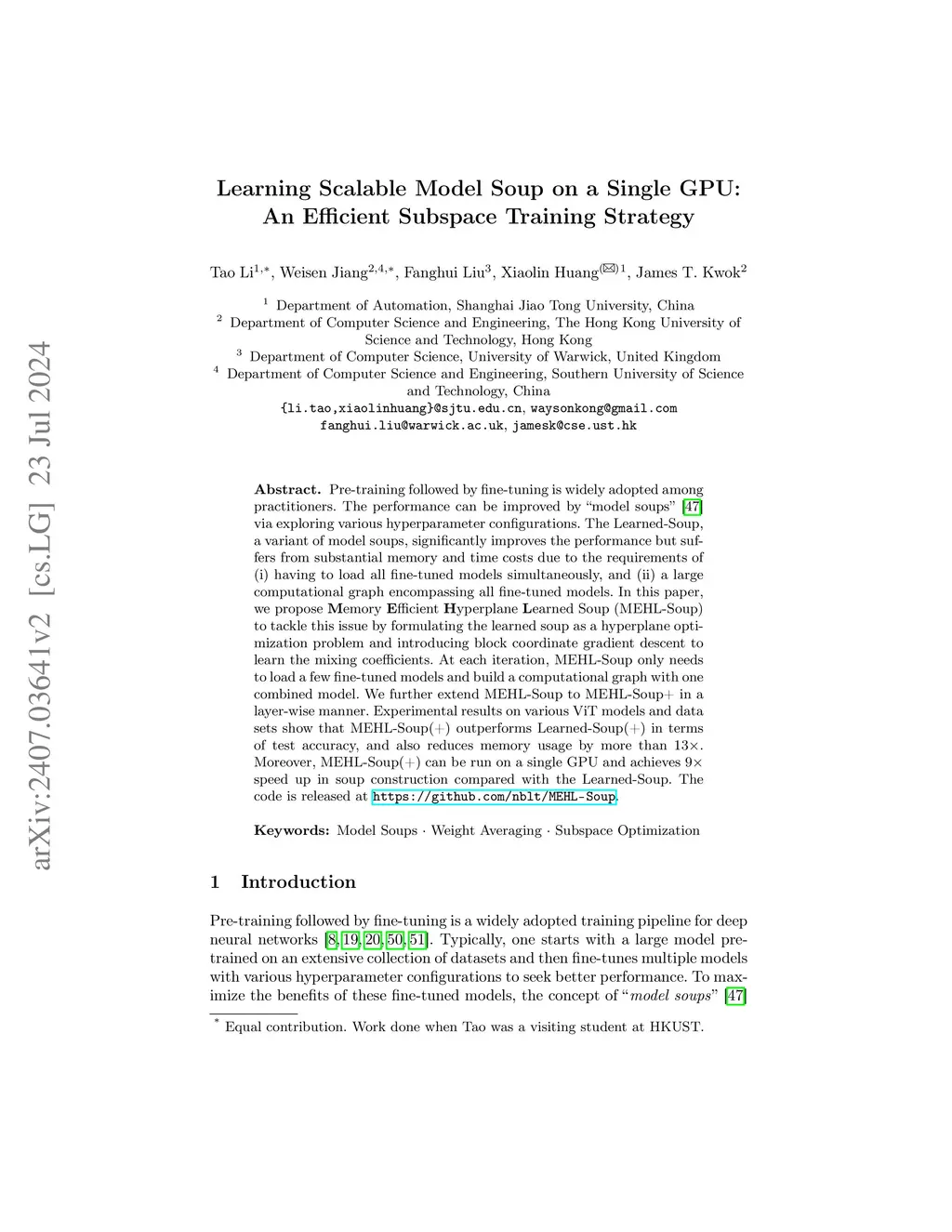Pre-training followed by fine-tuning is widely adopted among practitioners. The performance can be improved by "model soups"~\cite{wortsman2022model} via exploring various hyperparameter configurations.The Learned-Soup, a variant of model soups, significantly improves the performance but suffers from substantial memory and time costs due to the requirements of (i) having to load all fine-tuned models simultaneously, and (ii) a large computational graph encompassing all fine-tuned models. In this paper, we propose Memory Efficient Hyperplane Learned Soup (MEHL-Soup) to tackle this issue by formulating the learned soup as a hyperplane optimization problem and introducing block coordinate gradient descent to learn the mixing coefficients. At each iteration, MEHL-Soup only needs to load a few fine-tuned models and build a computational graph with one combined model. We further extend MEHL-Soup to MEHL-Soup+ in a layer-wise manner. Experimental results on various ViT models and data sets show that MEHL-Soup(+) outperforms Learned-Soup(+) in terms of test accuracy, and also reduces memory usage by more than . Moreover, MEHL-Soup(+) can be run on a single GPU and achieves speed up in soup construction compared with the Learned-Soup. The code is released at https://github.com/nblt/MEHL-Soup.