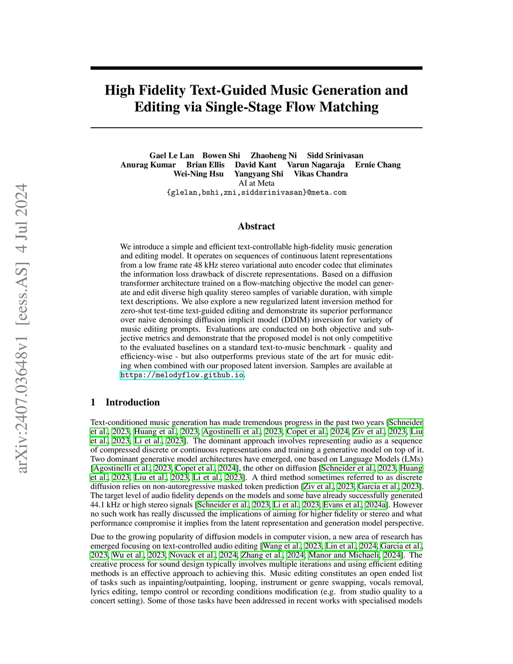 We introduce a simple and efficient text-controllable high-fidelity music generation and editing model. It operates on sequences of continuous latent representations from a low frame rate 48 kHz stereo variational auto encoder codec that eliminates the information loss drawback of discrete representations. Based on a diffusion transformer architecture trained on a flow-matching objective the model can generate and edit diverse high quality stereo samples of variable duration, with simple text descriptions. We also explore a new regularized latent inversion method for zero-shot test-time text-guided editing and demonstrate its superior performance over naive denoising diffusion implicit model (DDIM) inversion for variety of music editing prompts. Evaluations are conducted on both objective and subjective metrics and demonstrate that the proposed model is not only competitive to the evaluated baselines on a standard text-to-music benchmark - quality and efficiency-wise - but also outperforms previous state of the art for music editing when combined with our proposed latent inversion. Samples are available at https://melodyflow.github.io.