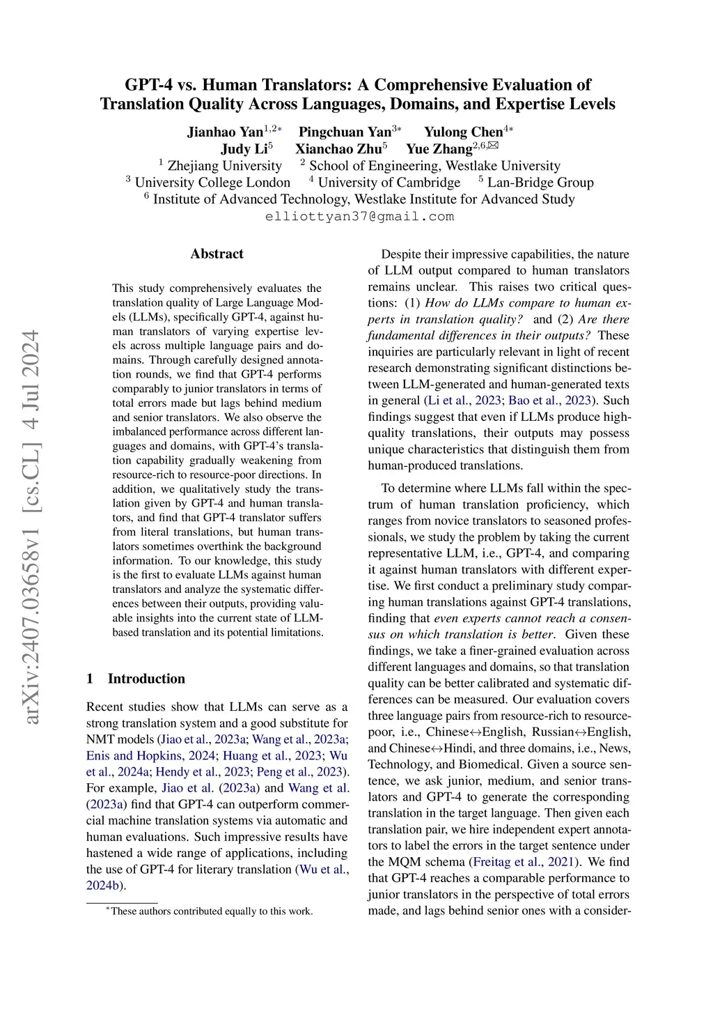 This study comprehensively evaluates the translation quality of Large Language Models (LLMs), specifically GPT-4, against human translators of varying expertise levels across multiple language pairs and domains. Through carefully designed annotation rounds, we find that GPT-4 performs comparably to junior translators in terms of total errors made but lags behind medium and senior translators. We also observe the imbalanced performance across different languages and domains, with GPT-4's translation capability gradually weakening from resource-rich to resource-poor directions. In addition, we qualitatively study the translation given by GPT-4 and human translators, and find that GPT-4 translator suffers from literal translations, but human translators sometimes overthink the background information. To our knowledge, this study is the first to evaluate LLMs against human translators and analyze the systematic differences between their outputs, providing valuable insights into the current state of LLM-based translation and its potential limitations.