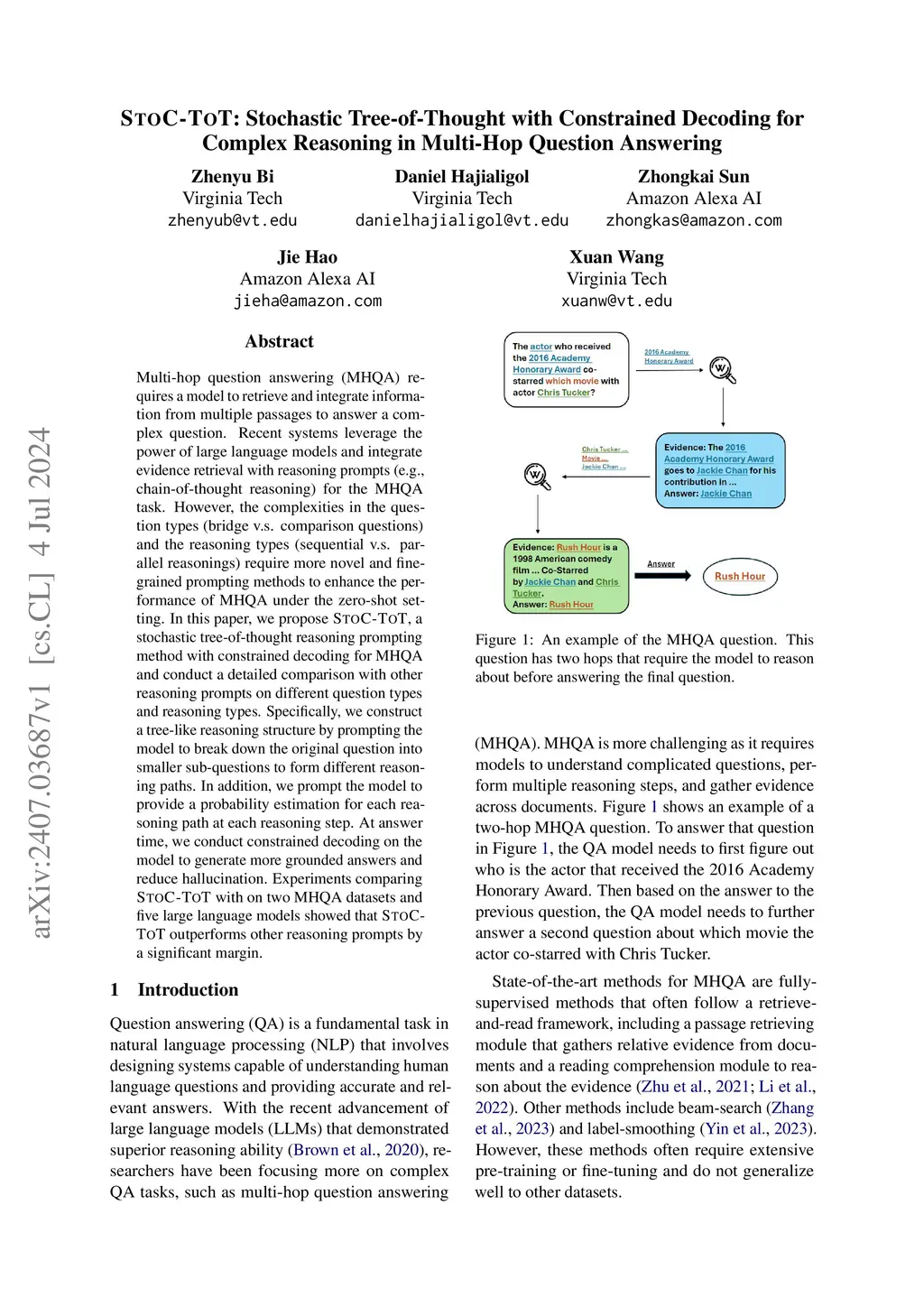 Multi-hop question answering (MHQA) requires a model to retrieve and integrate information from multiple passages to answer a complex question. Recent systems leverage the power of large language models and integrate evidence retrieval with reasoning prompts (e.g., chain-of-thought reasoning) for the MHQA task. However, the complexities in the question types (bridge v.s. comparison questions) and the reasoning types (sequential v.s. parallel reasonings) require more novel and fine-grained prompting methods to enhance the performance of MHQA under the zero-shot setting. In this paper, we propose STOC-TOT, a stochastic tree-of-thought reasoning prompting method with constrained decoding for MHQA and conduct a detailed comparison with other reasoning prompts on different question types and reasoning types. Specifically, we construct a tree-like reasoning structure by prompting the model to break down the original question into smaller sub-questions to form different reasoning paths. In addition, we prompt the model to provide a probability estimation for each reasoning path at each reasoning step. At answer time, we conduct constrained decoding on the model to generate more grounded answers and reduce hallucination. Experiments comparing STOC-TOT with two MHQA datasets and five large language models showed that our framework outperforms other reasoning prompts by a significant margin.