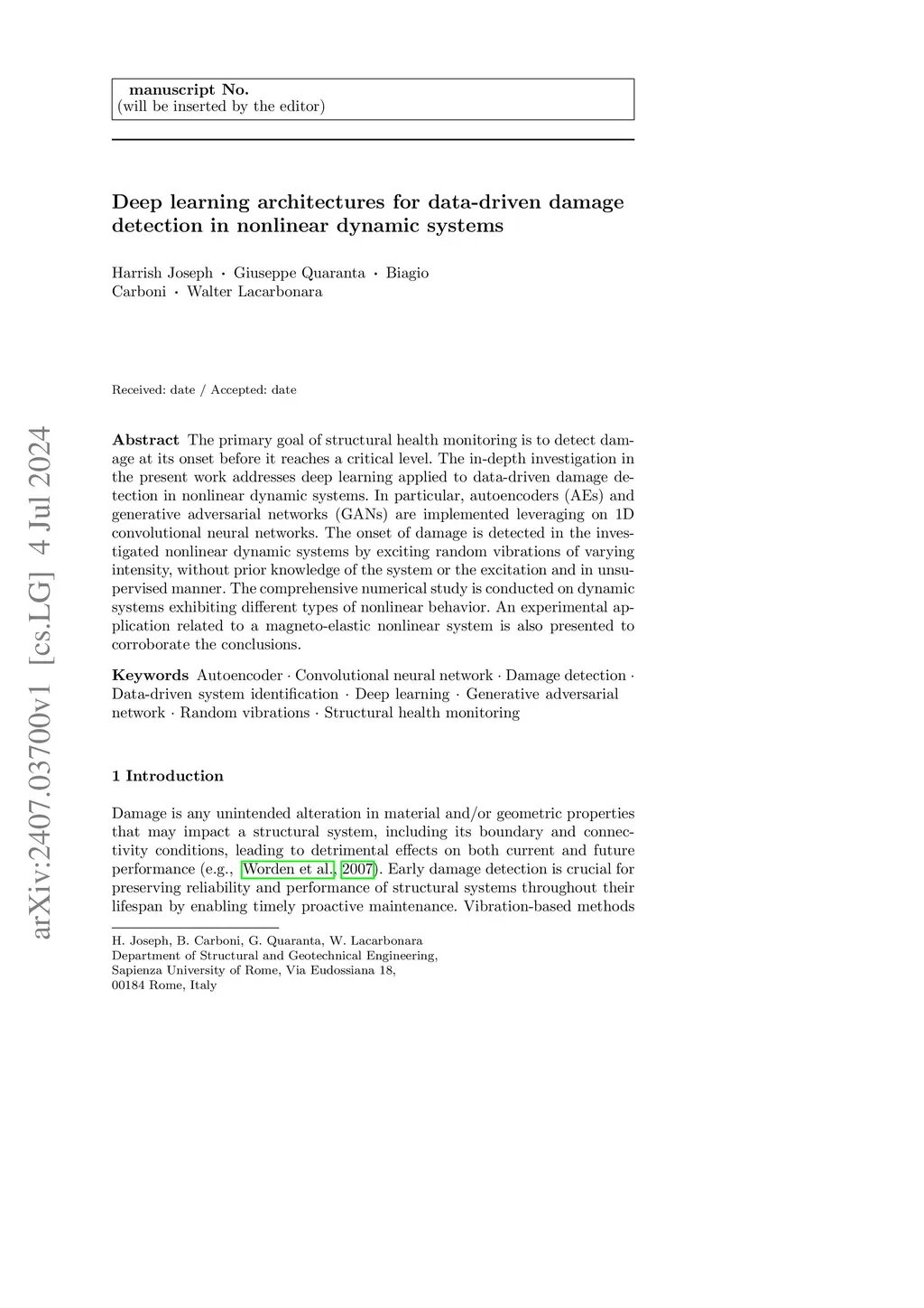 The primary goal of structural health monitoring is to detect damage at its onset before it reaches a critical level. The in-depth investigation in the present work addresses deep learning applied to data-driven damage detection in nonlinear dynamic systems. In particular, autoencoders (AEs) and generative adversarial networks (GANs) are implemented leveraging on 1D convolutional neural networks. The onset of damage is detected in the investigated nonlinear dynamic systems by exciting random vibrations of varying intensity, without prior knowledge of the system or the excitation and in unsupervised manner. The comprehensive numerical study is conducted on dynamic systems exhibiting different types of nonlinear behavior. An experimental application related to a magneto-elastic nonlinear system is also presented to corroborate the conclusions.