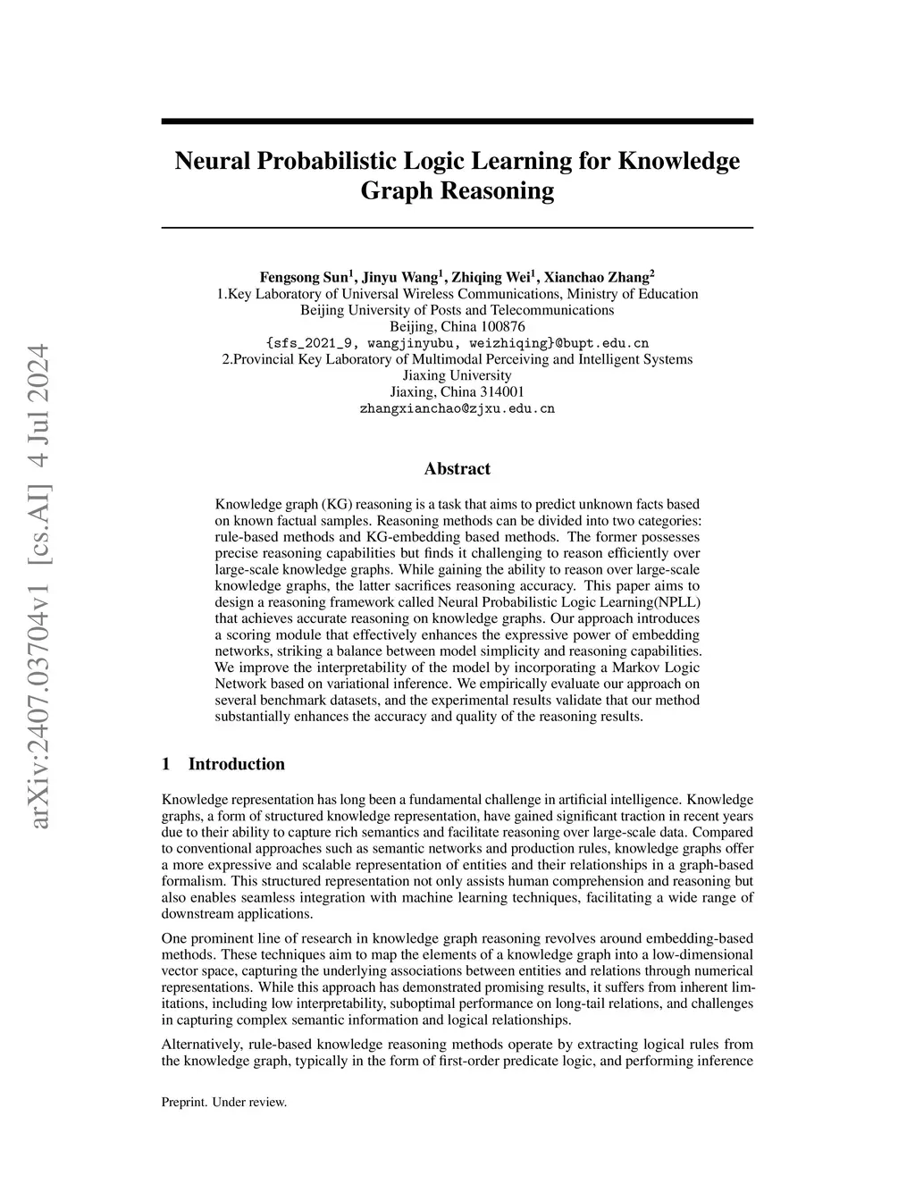 Knowledge graph (KG) reasoning is a task that aims to predict unknown facts based on known factual samples. Reasoning methods can be divided into two categories: rule-based methods and KG-embedding based methods. The former possesses precise reasoning capabilities but finds it challenging to reason efficiently over large-scale knowledge graphs. While gaining the ability to reason over large-scale knowledge graphs, the latter sacrifices reasoning accuracy. This paper aims to design a reasoning framework called Neural Probabilistic Logic Learning(NPLL) that achieves accurate reasoning on knowledge graphs. Our approach introduces a scoring module that effectively enhances the expressive power of embedding networks, striking a balance between model simplicity and reasoning capabilities. We improve the interpretability of the model by incorporating a Markov Logic Network based on variational inference. We empirically evaluate our approach on several benchmark datasets, and the experimental results validate that our method substantially enhances the accuracy and quality of the reasoning results.