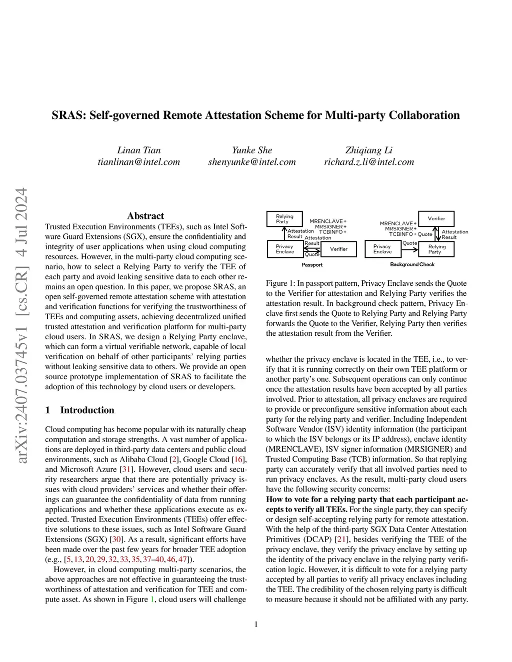 Trusted Execution Environments (TEEs), such as Intel Software Guard Extensions (SGX), ensure the confidentiality and integrity of user applications when using cloud computing resources. However, in the multi-party cloud computing scenario, how to select a Relying Party to verify the TEE of each party and avoid leaking sensitive data to each other remains an open question. In this paper, we propose SRAS, an open self-governed remote attestation scheme with attestation and verification functions for verifying the trustworthiness of TEEs and computing assets, achieving decentralized unified trusted attestation and verification platform for multi-party cloud users. In SRAS, we design a Relying Party enclave, which can form a virtual verifiable network, capable of local verification on behalf of other participants relying parties without leaking sensitive data to others. We provide an open-source prototype implementation of SRAS to facilitate the adoption of this technology by cloud users or developers.