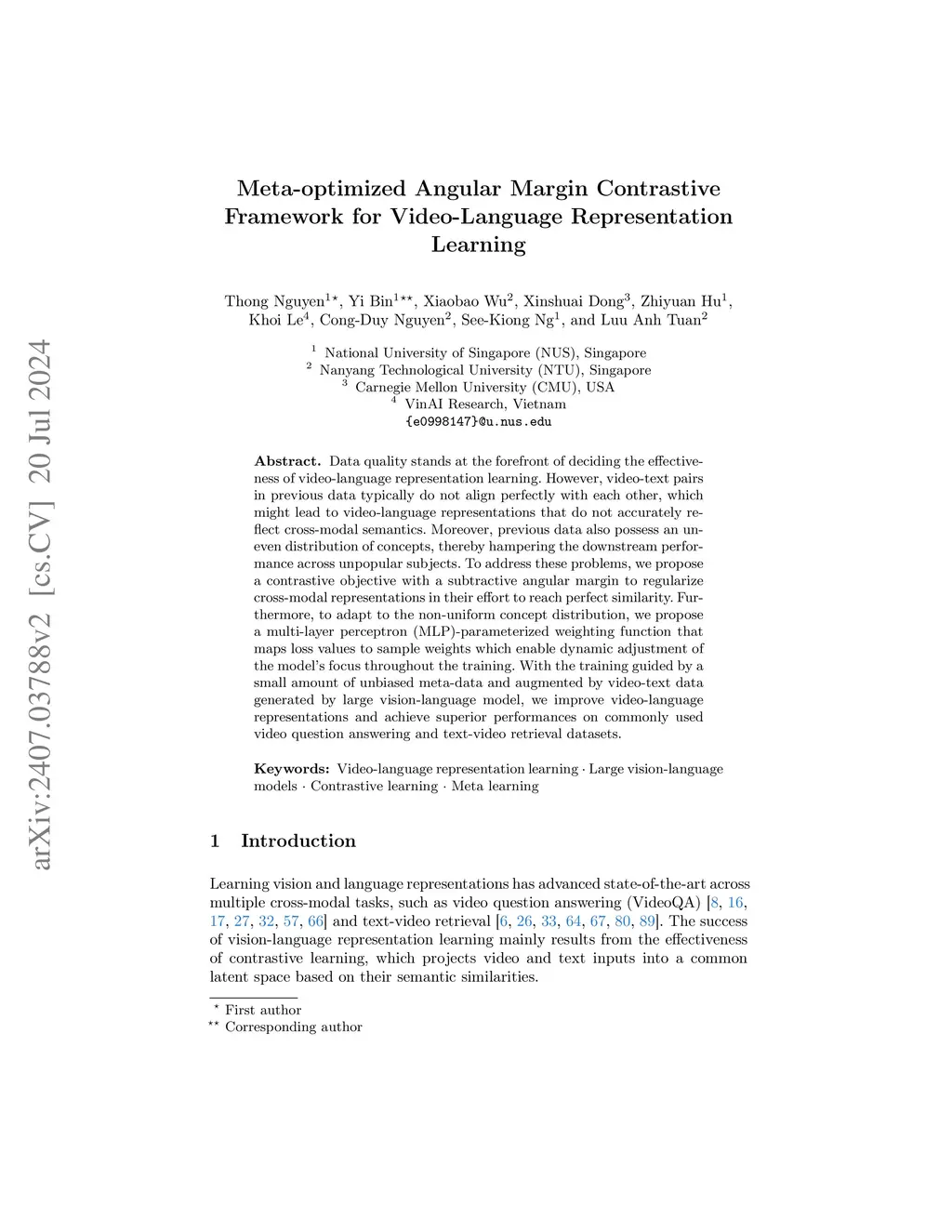 Meta-optimized Angular Margin Contrastive Framework for Video-Language