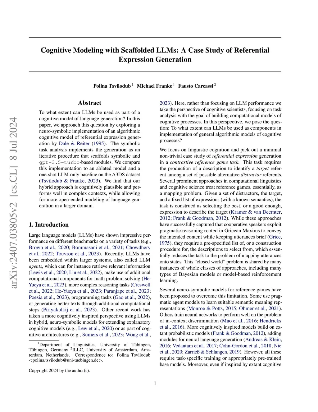 To what extent can LLMs be used as part of a cognitive model of language generation? In this paper, we approach this question by exploring a neuro-symbolic implementation of an algorithmic cognitive model of referential expression generation by Dale & Reiter (1995). The symbolic task analysis implements the generation as an iterative procedure that scaffolds symbolic and gpt-3.5-turbo-based modules. We compare this implementation to an ablated model and a one-shot LLM-only baseline on the A3DS dataset (Tsvilodub & Franke, 2023). We find that our hybrid approach is cognitively plausible and performs well in complex contexts, while allowing for more open-ended modeling of language generation in a larger domain.