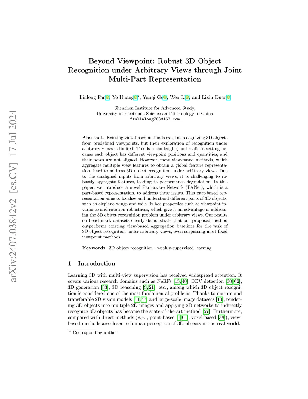Existing view-based methods excel at recognizing 3D objects from predefined viewpoints, but their exploration of recognition under arbitrary views is limited. This is a challenging and realistic setting because each object has different viewpoint positions and quantities, and their poses are not aligned. However, most view-based methods, which aggregate multiple view features to obtain a global feature representation, hard to address 3D object recognition under arbitrary views. Due to the unaligned inputs from arbitrary views, it is challenging to robustly aggregate features, leading to performance degradation. In this paper, we introduce a novel Part-aware Network (PANet), which is a part-based representation, to address these issues. This part-based representation aims to localize and understand different parts of 3D objects, such as airplane wings and tails. It has properties such as viewpoint invariance and rotation robustness, which give it an advantage in addressing the 3D object recognition problem under arbitrary views. Our results on benchmark datasets clearly demonstrate that our proposed method outperforms existing view-based aggregation baselines for the task of 3D object recognition under arbitrary views, even surpassing most fixed viewpoint methods.