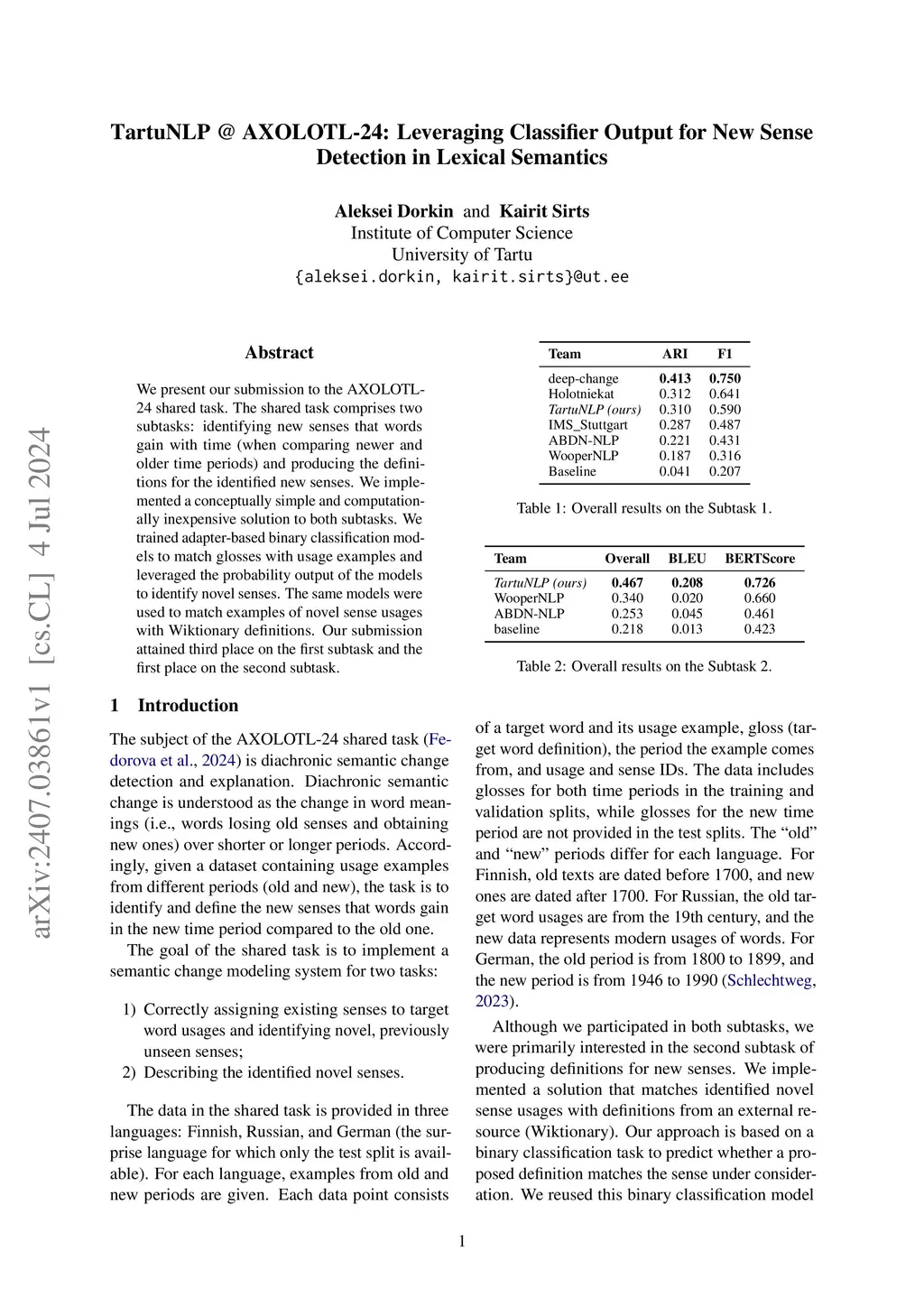 TartuNLP @ AXOLOTL-24: Leveraging Classifier Output for New Sense