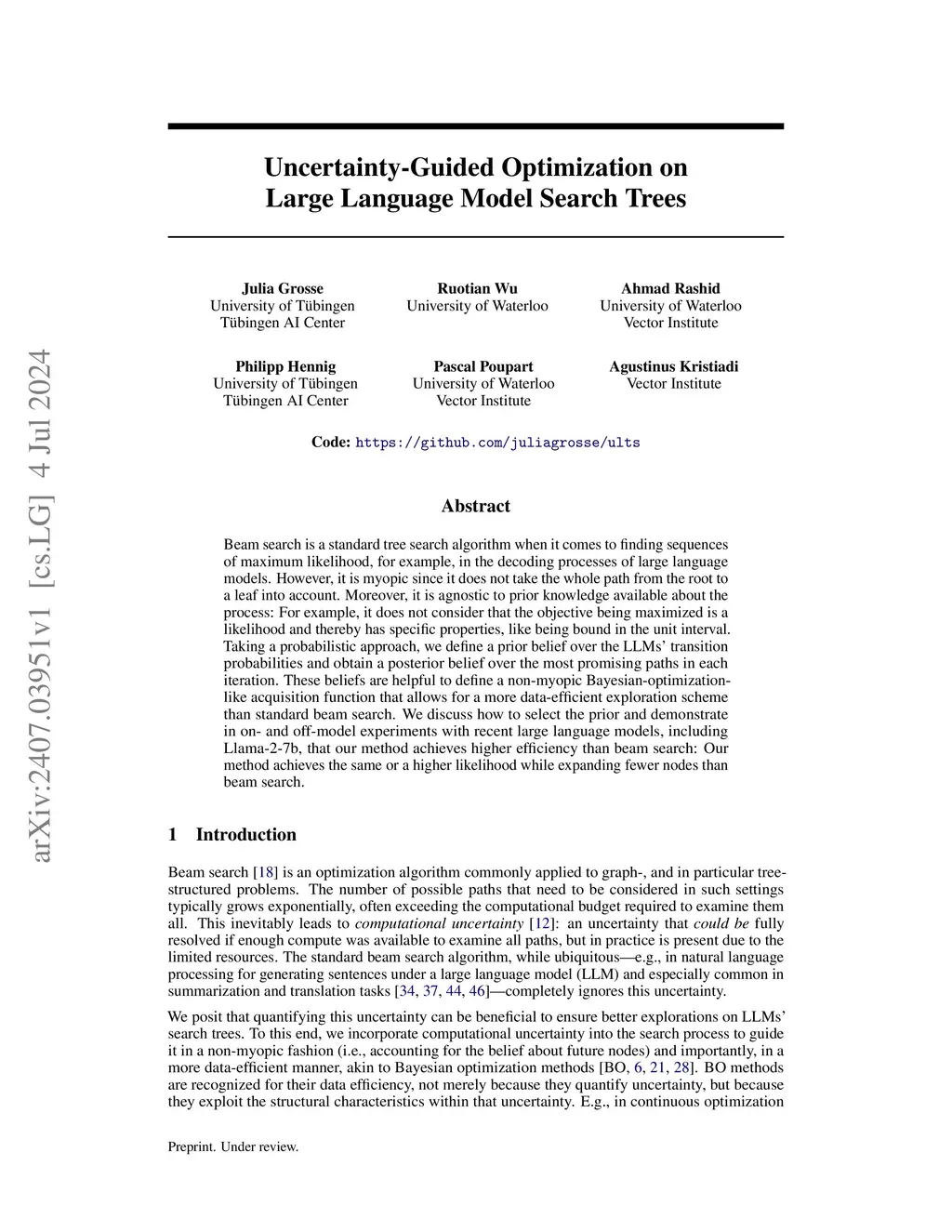 Tree search is a fundamental tool for planning, as many sequential decision-making problems can be framed as searching over tree-structured spaces. We propose an uncertainty-guided tree search algorithm for settings where the reward function is a log-likelihood function of the paths. Due to the combinatorial explosion of the tree size, the set of paths for which one can obtain rewards is sparse, particularly when the likelihood is obtained through expensive evaluations, such as by querying a large language model. We address this challenge by deriving an probabilistic search heuristic based on regularity assumptions for the likelihood. Unlike existing tree search methods, the proposed method can perform backtracking and trade-off exploration with exploitation, and yet does not require expensive roll-outs, or sophisticated Bayesian inference. Through extensive on-model and off-model experiments on timely, large-scale practical applications, we demonstrate that our method identifies paths with high likelihood while requiring fewer costly evaluations.