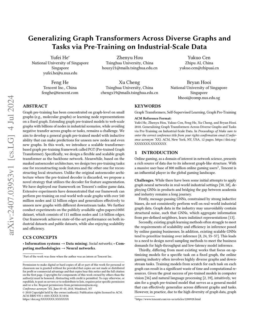 Graph pre-training has been concentrated on graph-level tasks involving small graphs (e.g., molecular graphs) or learning node representations on a fixed graph. Extending graph pre-trained models to web-scale graphs with billions of nodes in industrial scenarios, while avoiding negative transfer across graphs or tasks, remains a challenge. We aim to develop a general graph pre-trained model with inductive ability that can make predictions for unseen new nodes and even new graphs. In this work, we introduce a scalable transformer-based graph pre-training framework called PGT (Pre-trained Graph Transformer). Based on the masked autoencoder architecture, we design two pre-training tasks: one for reconstructing node features and the other for reconstructing local structures. Unlike the original autoencoder architecture where the pre-trained decoder is discarded, we propose a novel strategy that utilizes the decoder for feature augmentation. Our framework, tested on the publicly available ogbn-papers100M dataset with 111 million nodes and 1.6 billion edges, achieves state-of-the-art performance, showcasing scalability and efficiency. We have deployed our framework on Tencent's online game data, confirming its capability to pre-train on real-world graphs with over 540 million nodes and 12 billion edges and to generalize effectively across diverse static and dynamic downstream tasks.