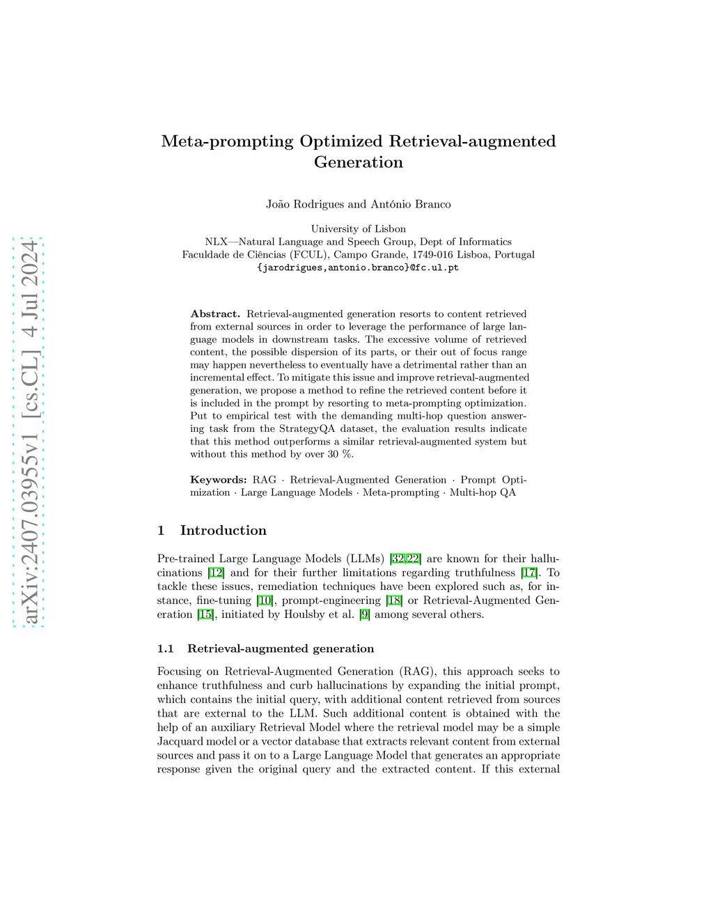 Retrieval-augmented generation resorts to content retrieved from external sources in order to leverage the performance of large language models in downstream tasks. The excessive volume of retrieved content, the possible dispersion of its parts, or their out of focus range may happen nevertheless to eventually have a detrimental rather than an incremental effect. To mitigate this issue and improve retrieval-augmented generation, we propose a method to refine the retrieved content before it is included in the prompt by resorting to meta-prompting optimization. Put to empirical test with the demanding multi-hop question answering task from the StrategyQA dataset, the evaluation results indicate that this method outperforms a similar retrieval-augmented system but without this method by over 30%.