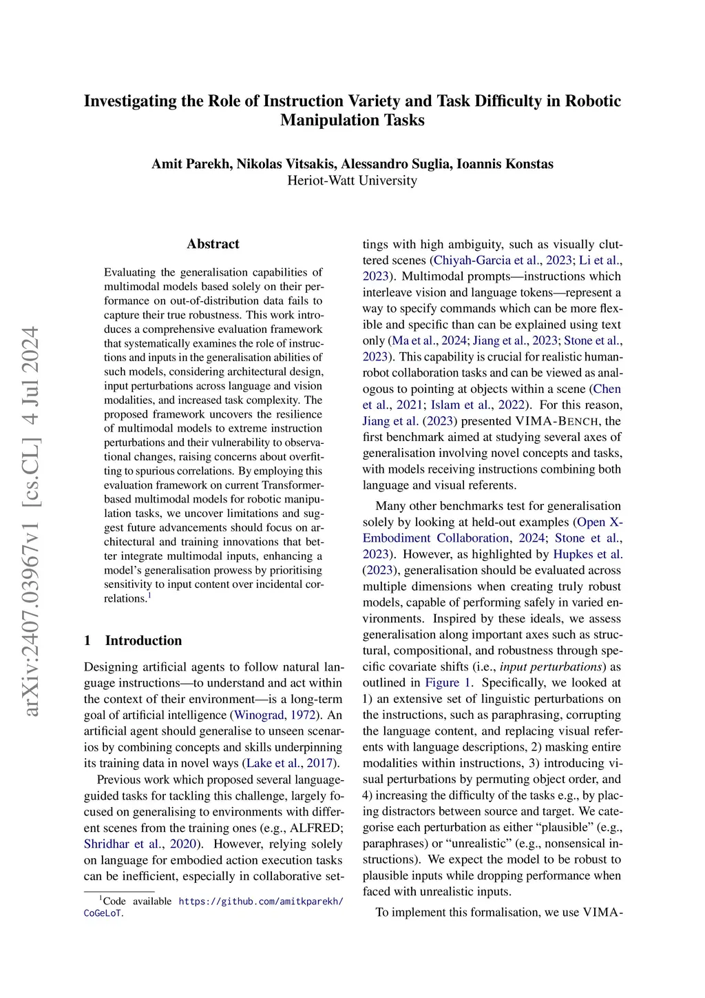 Evaluating the generalisation capabilities of multimodal models based solely on their performance on out-of-distribution data fails to capture their true robustness. This work introduces a comprehensive evaluation framework that systematically examines the role of instructions and inputs in the generalisation abilities of such models, considering architectural design, input perturbations across language and vision modalities, and increased task complexity. The proposed framework uncovers the resilience of multimodal models to extreme instruction perturbations and their vulnerability to observational changes, raising concerns about overfitting to spurious correlations. By employing this evaluation framework on current Transformer-based multimodal models for robotic manipulation tasks, we uncover limitations and suggest future advancements should focus on architectural and training innovations that better integrate multimodal inputs, enhancing a model's generalisation prowess by prioritising sensitivity to input content over incidental correlations.