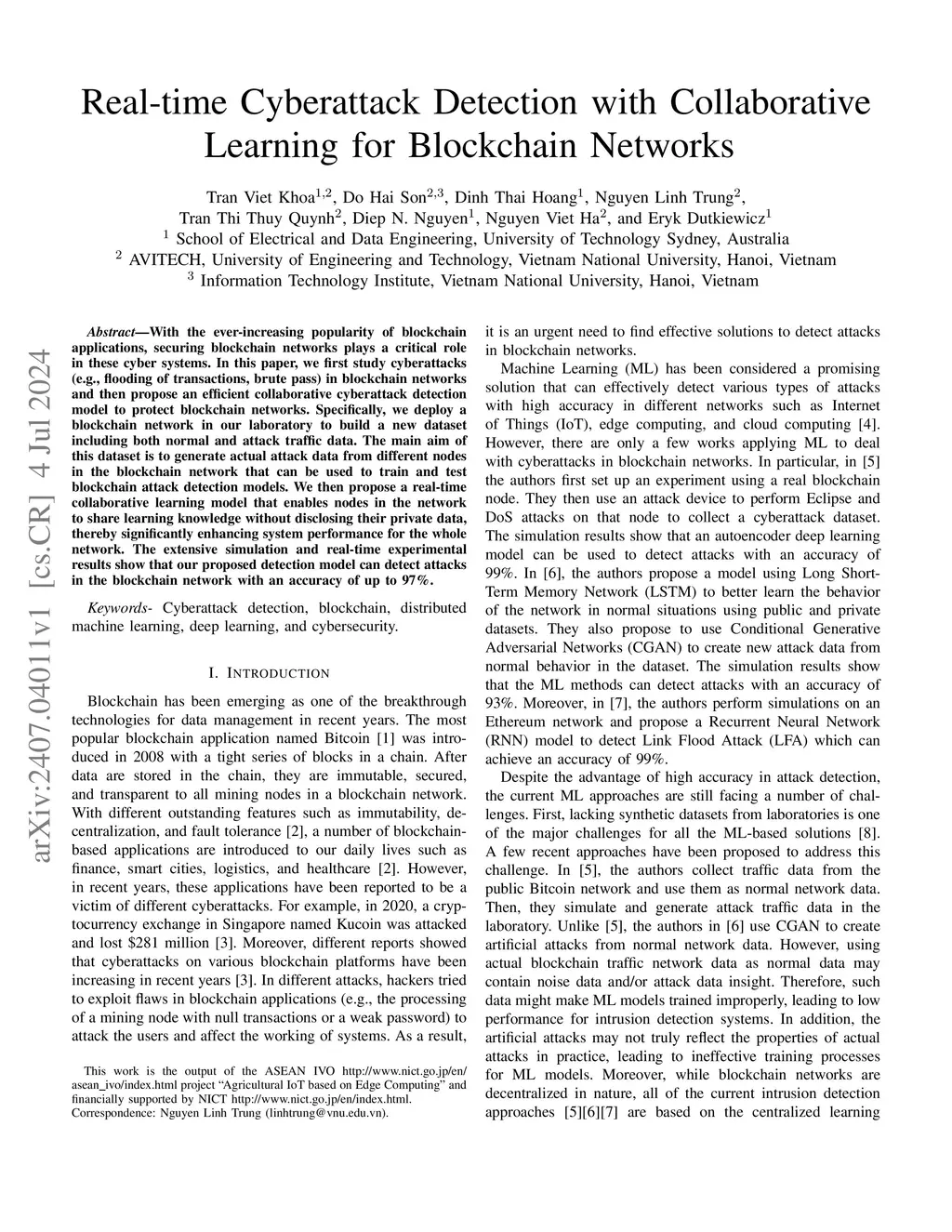 With the ever-increasing popularity of blockchain applications, securing blockchain networks plays a critical role in these cyber systems. In this paper, we first study cyberattacks (e.g., flooding of transactions, brute pass) in blockchain networks and then propose an efficient collaborative cyberattack detection model to protect blockchain networks. Specifically, we deploy a blockchain network in our laboratory to build a new dataset including both normal and attack traffic data. The main aim of this dataset is to generate actual attack data from different nodes in the blockchain network that can be used to train and test blockchain attack detection models. We then propose a real-time collaborative learning model that enables nodes in the network to share learning knowledge without disclosing their private data, thereby significantly enhancing system performance for the whole network. The extensive simulation and real-time experimental results show that our proposed detection model can detect attacks in the blockchain network with an accuracy of up to 97%.