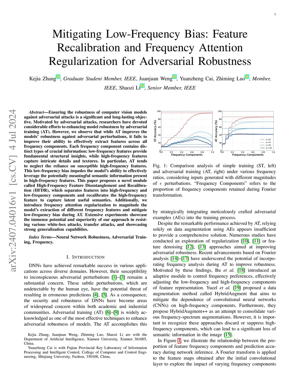 Ensuring the robustness of deep neural networks against adversarial attacks remains a fundamental challenge in computer vision. While adversarial training (AT) has emerged as a promising defense strategy, our analysis reveals a critical limitation: AT-trained models exhibit a bias toward low-frequency features while neglecting high-frequency components. This bias is particularly concerning as each frequency component carries distinct and crucial information: low-frequency features encode fundamental structural patterns, while high-frequency features capture intricate details and textures. To address this limitation, we propose High-Frequency Feature Disentanglement and Recalibration (HFDR), a novel module that strategically separates and recalibrates frequency-specific features to capture latent semantic cues. We further introduce frequency attention regularization to harmonize feature extraction across the frequency spectrum and mitigate the inherent low-frequency bias of AT. Extensive experiments demonstrate our method's superior performance against white-box attacks and transfer attacks, while exhibiting strong generalization capabilities across diverse scenarios.