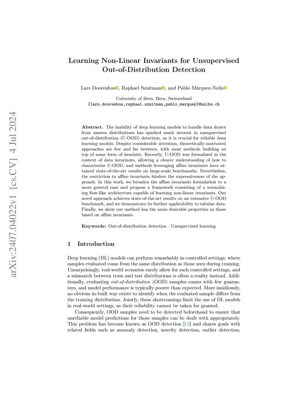 The inability of deep learning models to handle data drawn from unseen distributions has sparked much interest in unsupervised out-of-distribution (U-OOD) detection, as it is crucial for reliable deep learning models. Despite considerable attention, theoretically-motivated approaches are few and far between, with most methods building on top of some form of heuristic. Recently, U-OOD was formalized in the context of data invariants, allowing a clearer understanding of how to characterize U-OOD, and methods leveraging affine invariants have attained state-of-the-art results on large-scale benchmarks. Nevertheless, the restriction to affine invariants hinders the expressiveness of the approach. In this work, we broaden the affine invariants formulation to a more general case and propose a framework consisting of a normalizing flow-like architecture capable of learning non-linear invariants. Our novel approach achieves state-of-the-art results on an extensive U-OOD benchmark, and we demonstrate its further applicability to tabular data. Finally, we show our method has the same desirable properties as those based on affine invariants.