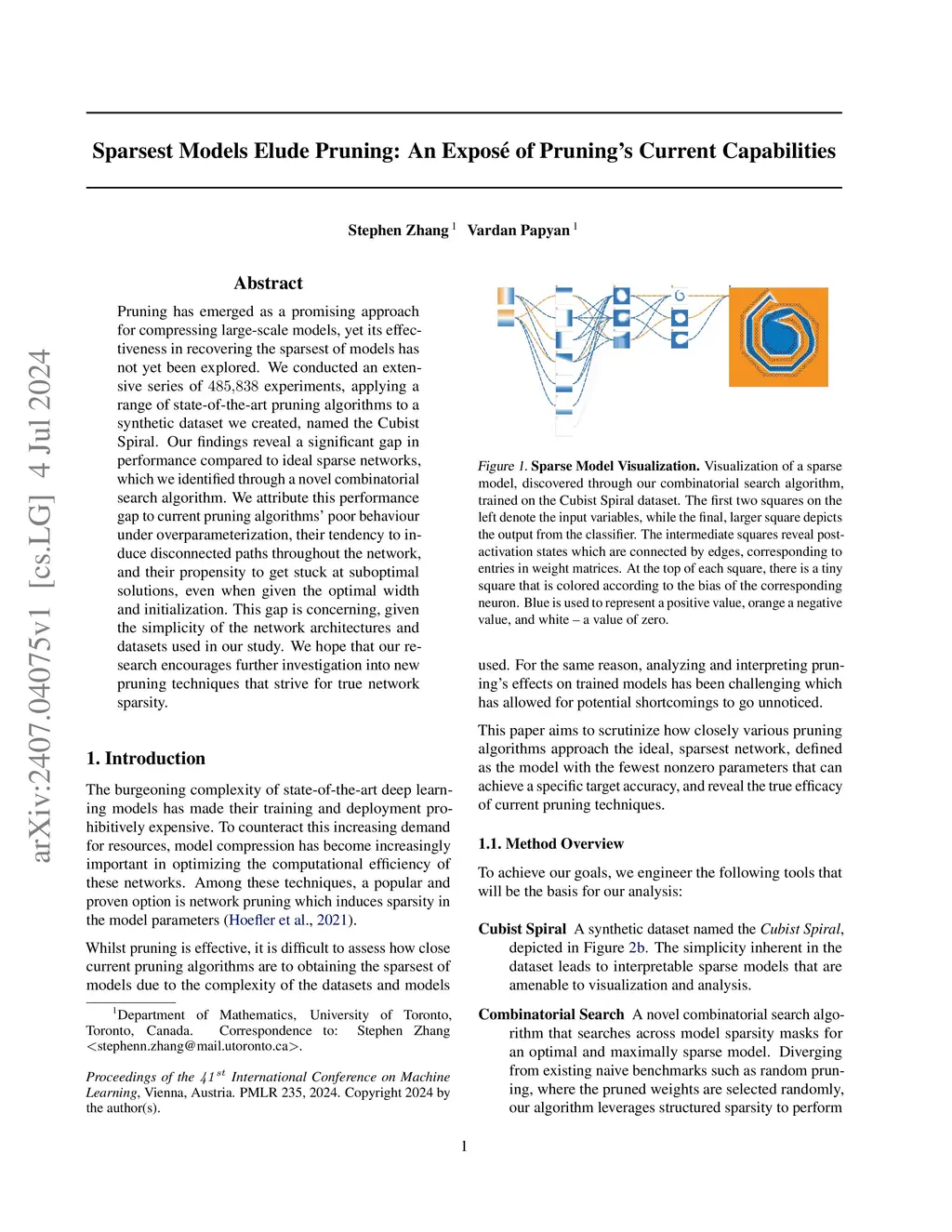 Pruning has emerged as a promising approach for compressing large-scale models, yet its effectiveness in recovering the sparsest of models has not yet been explored. We conducted an extensive series of 485,838 experiments, applying a range of state-of-the-art pruning algorithms to a synthetic dataset we created, named the Cubist Spiral. Our findings reveal a significant gap in performance compared to ideal sparse networks, which we identified through a novel combinatorial search algorithm. We attribute this performance gap to current pruning algorithms' poor behaviour under overparameterization, their tendency to induce disconnected paths throughout the network, and their propensity to get stuck at suboptimal solutions, even when given the optimal width and initialization. This gap is concerning, given the simplicity of the network architectures and datasets used in our study. We hope that our research encourages further investigation into new pruning techniques that strive for true network sparsity.