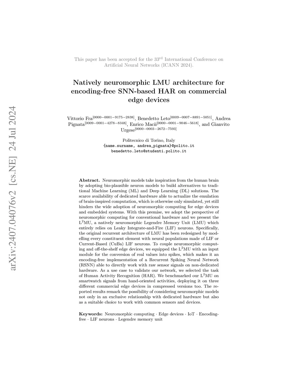 Neuromorphic models take inspiration from the human brain by adopting bio-plausible neuron models to build alternatives to traditional Machine Learning (ML) and Deep Learning (DL) solutions. The scarce availability of dedicated hardware able to actualize the emulation of brain-inspired computation, which is otherwise only simulated, yet still hinders the wide adoption of neuromorphic computing for edge devices and embedded systems. With this premise, we adopt the perspective of neuromorphic computing for conventional hardware and we present the L2MU, a natively neuromorphic Legendre Memory Unit (LMU) which entirely relies on Leaky Integrate-and-Fire (LIF) neurons. Specifically, the original recurrent architecture of LMU has been redesigned by modelling every constituent element with neural populations made of LIF or Current-Based (CuBa) LIF neurons. To couple neuromorphic computing and off-the-shelf edge devices, we equipped the L2MU with an input module for the conversion of real values into spikes, which makes it an encoding-free implementation of a Recurrent Spiking Neural Network (RSNN) able to directly work with raw sensor signals on non-dedicated hardware. As a use case to validate our network, we selected the task of Human Activity Recognition (HAR). We benchmarked our L2MU on smartwatch signals from hand-oriented activities, deploying it on three different commercial edge devices in compressed versions too. The reported results remark the possibility of considering neuromorphic models not only in an exclusive relationship with dedicated hardware but also as a suitable choice to work with common sensors and devices.