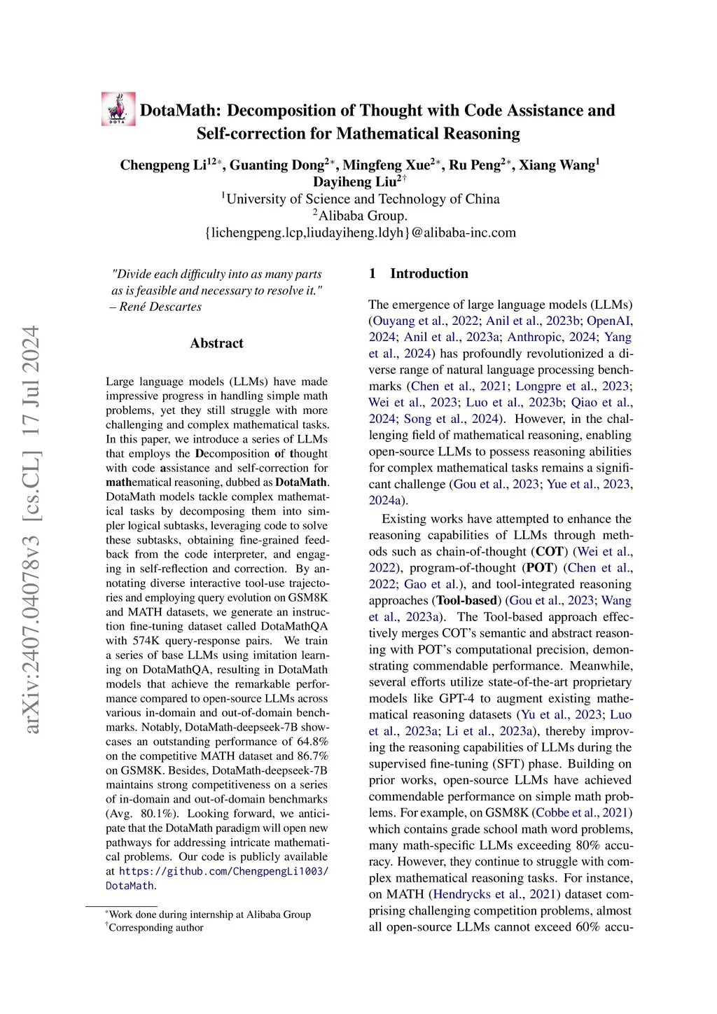 Large language models (LLMs) have made impressive progress in handling simple math problems, yet they still struggle with more challenging and complex mathematical tasks. In this paper, we introduce a series of LLMs that employs the Decomposition of thought with code assistance and self-correction for mathematical reasoning, dubbed as DotaMath. DotaMath models tackle complex mathematical tasks by decomposing them into simpler logical subtasks, leveraging code to solve these subtasks, obtaining fine-grained feedback from the code interpreter, and engaging in self-reflection and correction. By annotating diverse interactive tool-use trajectories and employing query evolution on GSM8K and MATH datasets, we generate an instruction fine-tuning dataset called DotaMathQA with 574K query-response pairs. We train a series of base LLMs using imitation learning on DotaMathQA, resulting in DotaMath models that achieve remarkable performance compared to open-source LLMs across various in-domain and out-of-domain benchmarks. Notably, DotaMath-deepseek-7B showcases an outstanding performance of 64.8% on the competitive MATH dataset and 86.7% on GSM8K. Besides, DotaMath-deepseek-7B maintains strong competitiveness on a series of in-domain and out-of-domain benchmarks (Avg. 80.1%). Looking forward, we anticipate that the DotaMath paradigm will open new pathways for addressing intricate mathematical problems. Our code is publicly available at https://github.com/ChengpengLi1003/DotaMath.