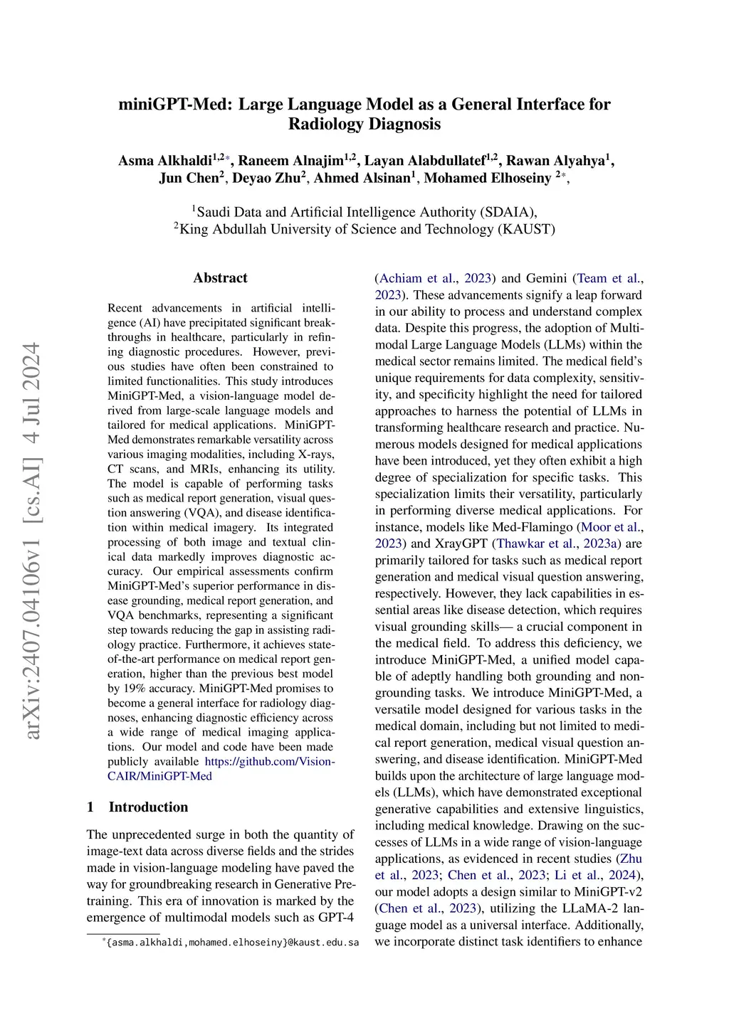 Recent advancements in artificial intelligence (AI) have precipitated significant breakthroughs in healthcare, particularly in refining diagnostic procedures. However, previous studies have often been constrained to limited functionalities. This study introduces MiniGPT-Med, a vision-language model derived from large-scale language models and tailored for medical applications. MiniGPT-Med demonstrates remarkable versatility across various imaging modalities, including X-rays, CT scans, and MRIs, enhancing its utility. The model is capable of performing tasks such as medical report generation, visual question answering (VQA), and disease identification within medical imagery. Its integrated processing of both image and textual clinical data markedly improves diagnostic accuracy. Our empirical assessments confirm MiniGPT-Med's superior performance in disease grounding, medical report generation, and VQA benchmarks, representing a significant step towards reducing the gap in assisting radiology practice. Furthermore, it achieves state-of-the-art performance on medical report generation, higher than the previous best model by 19\% accuracy. MiniGPT-Med promises to become a general interface for radiology diagnoses, enhancing diagnostic efficiency across a wide range of medical imaging applications.